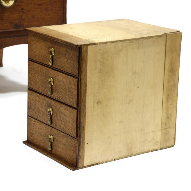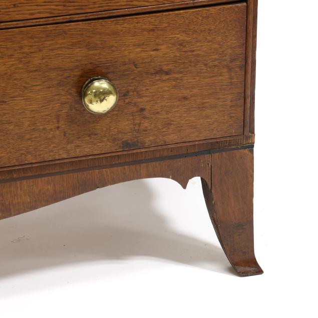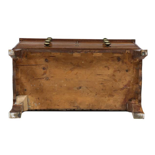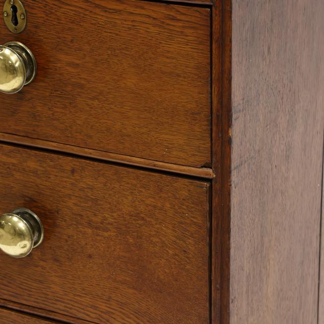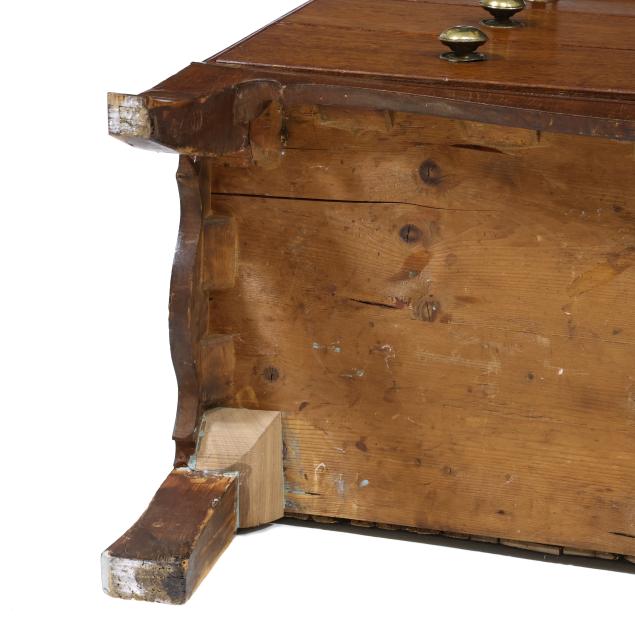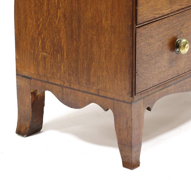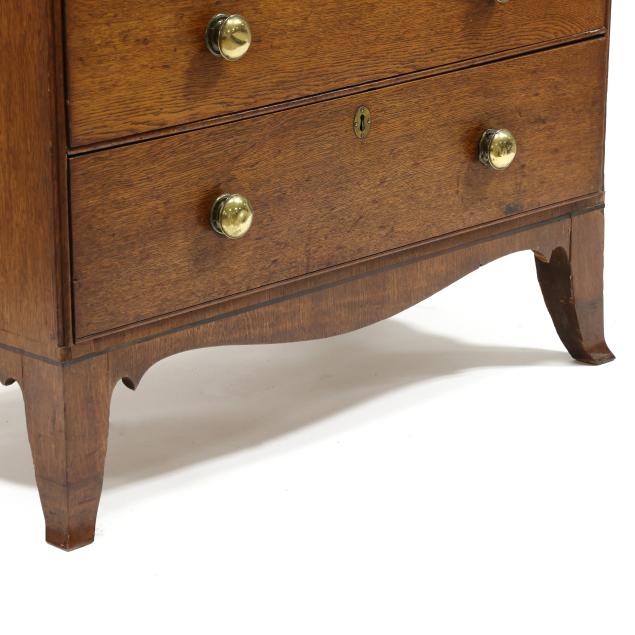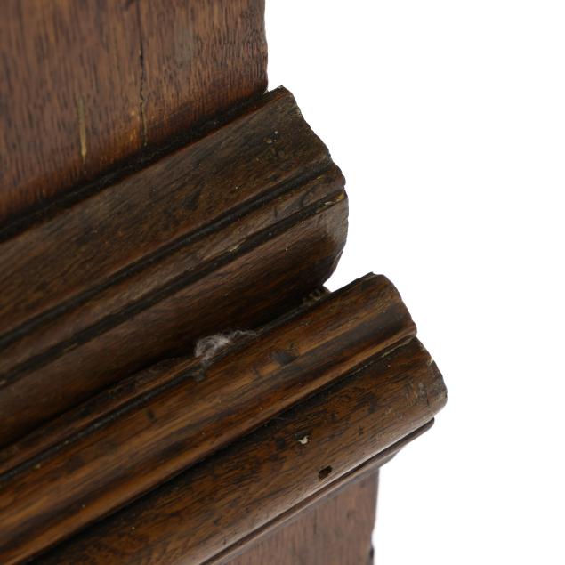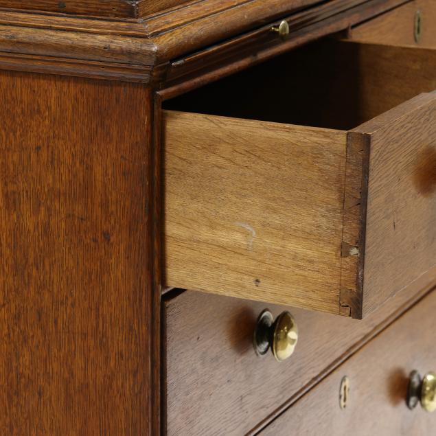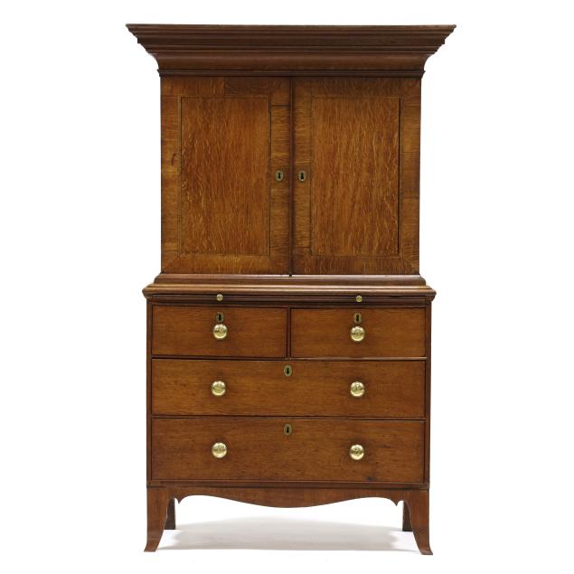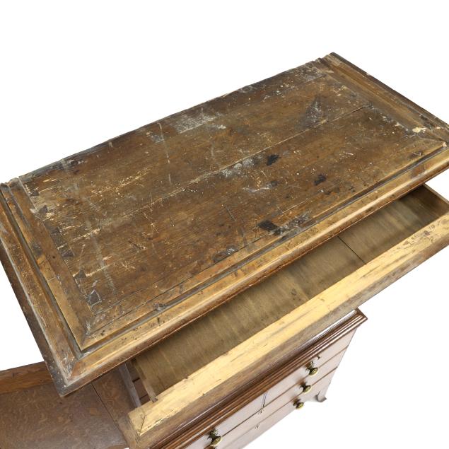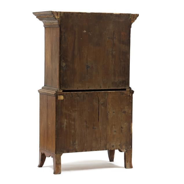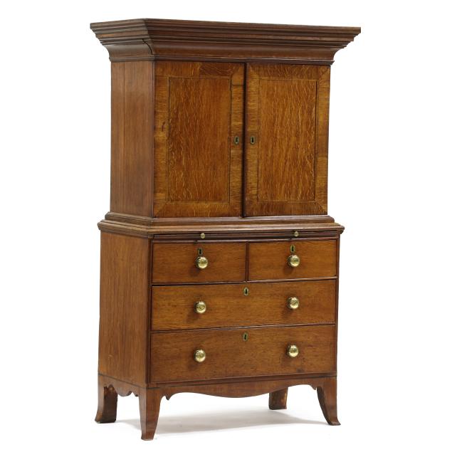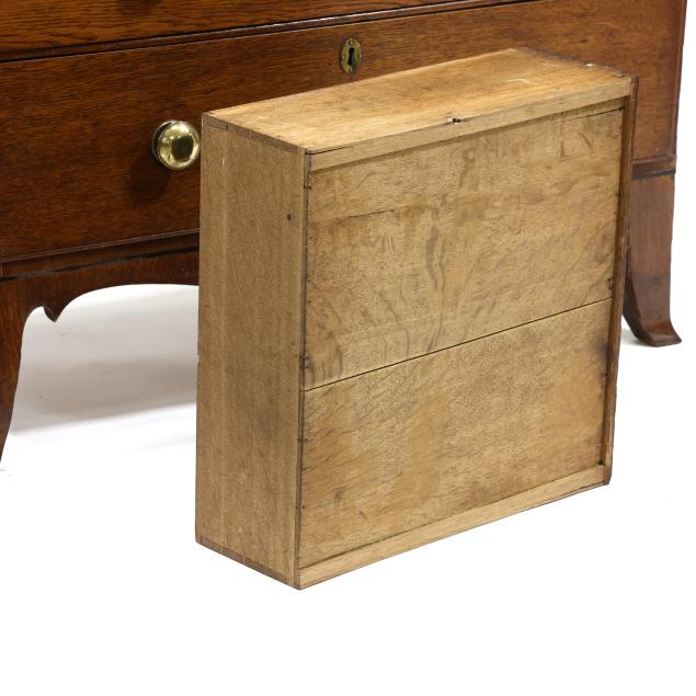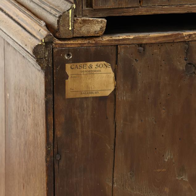 From the Collection of a Lady, Williamsburg, Virginia Overall good usable condition; some tight shrinkage cracks; old but later pulls; one interior hidden drawer with loss to fabric pull; shrinkage cracks to case sides; feet are old and appear original but with later facings the lower three inches.
