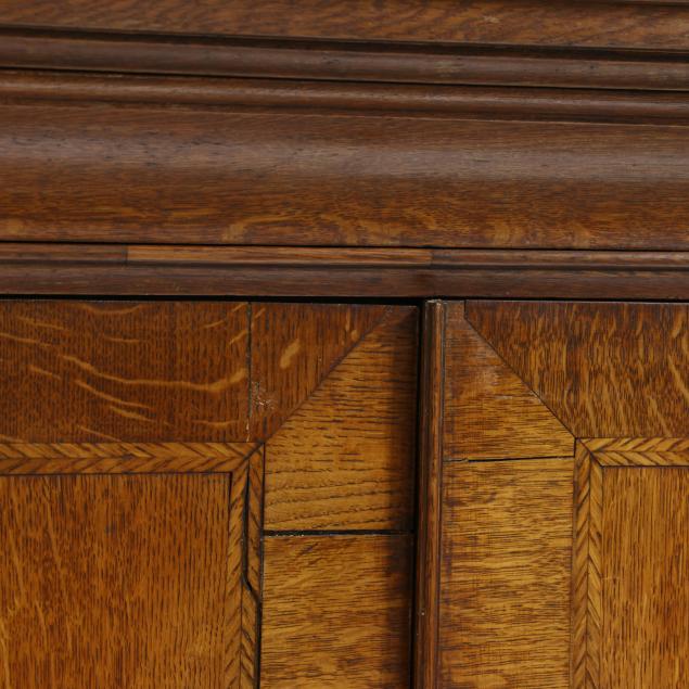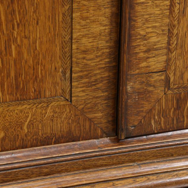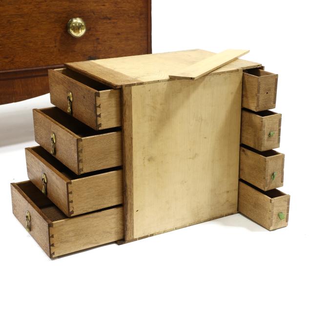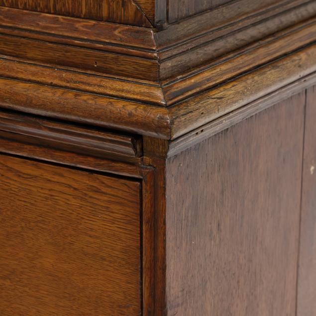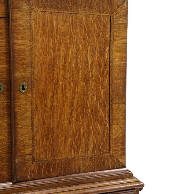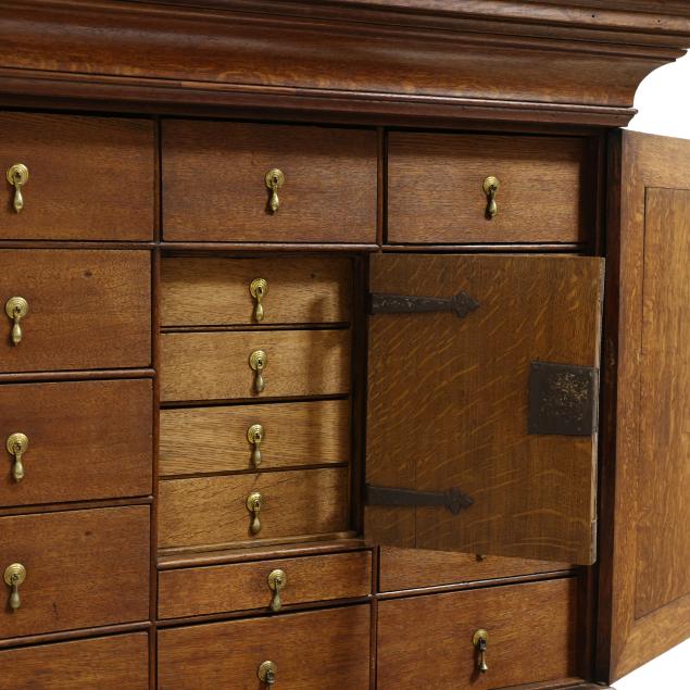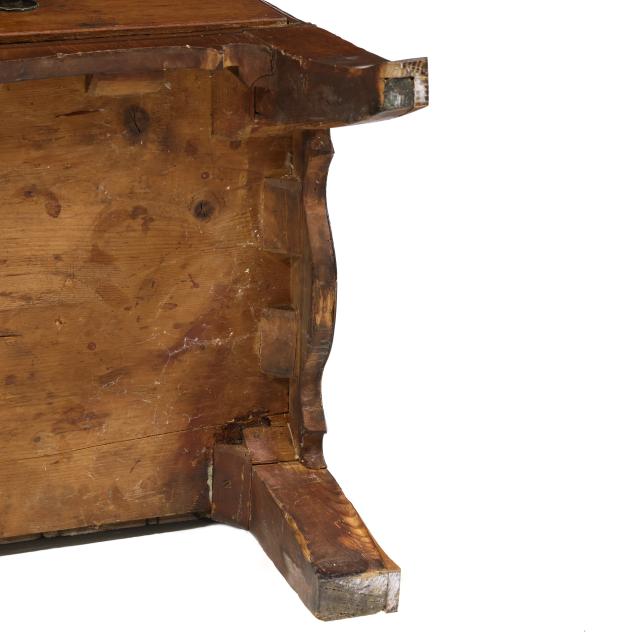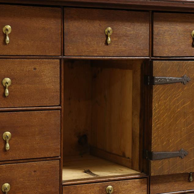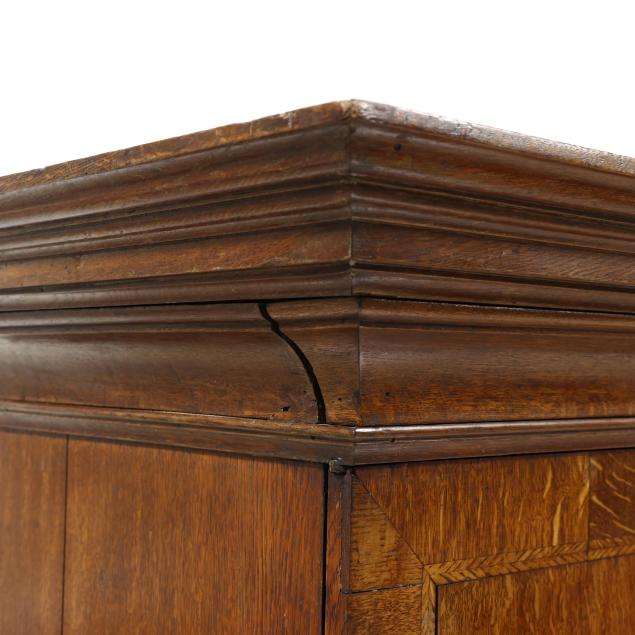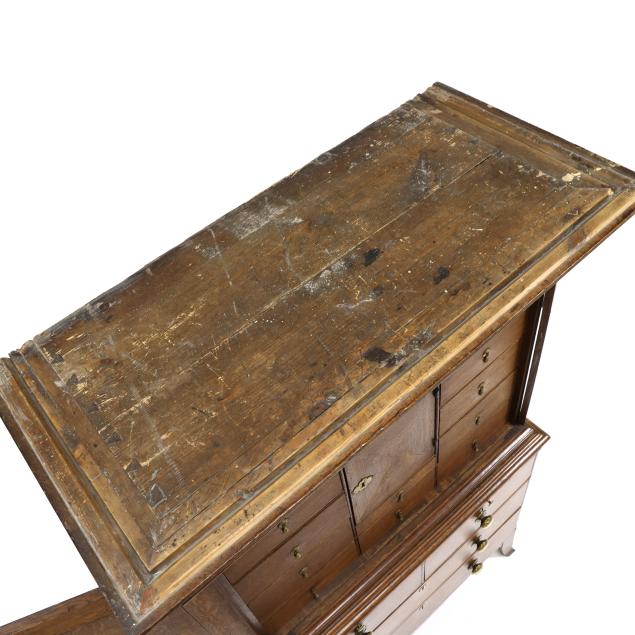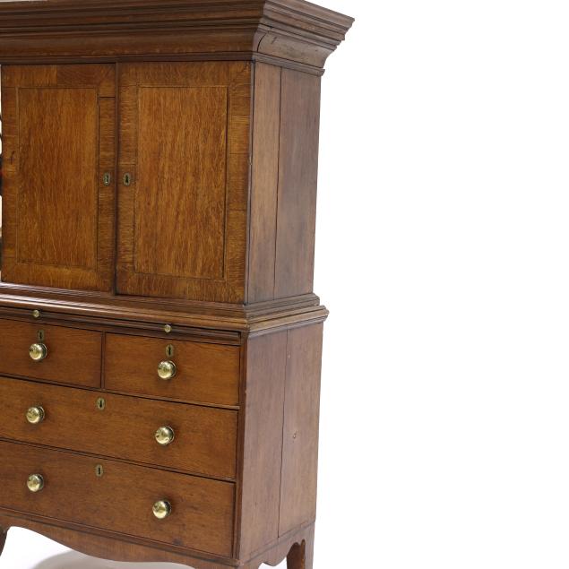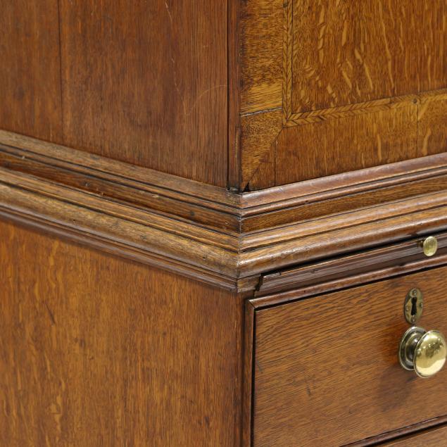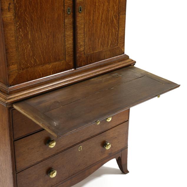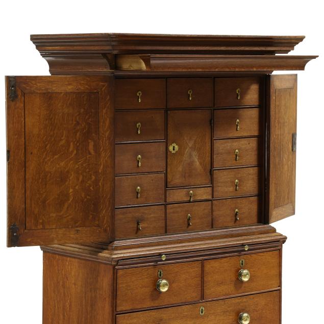 18th century, oak and pine secondary, two part form, cove molded cornice with hidden long drawer, upper case with two hinged flush panel doors with herringbone banded inlay, interior with (11) fitted drawers surrounding a hinged prospect door with repeating banded inlay, interior with four small drawers, the interior case with iron German hidden lock (accessible through a small hole under the bottom drawer) which released the cabinet to reveal four further small hidden drawers behind the rear right corner false panel; the base with applied molded edge, pull out slide over two graduated drawers with rounded case stile trim, scalloped skirt, French bracket feet.