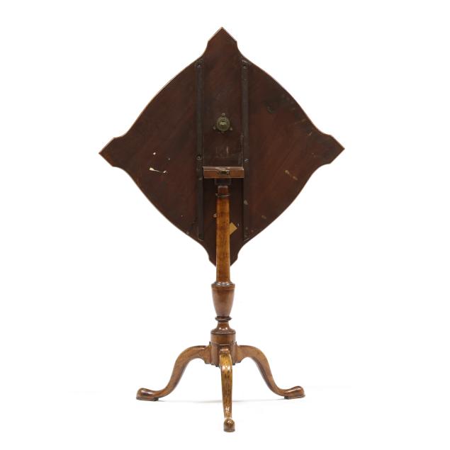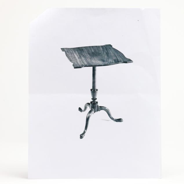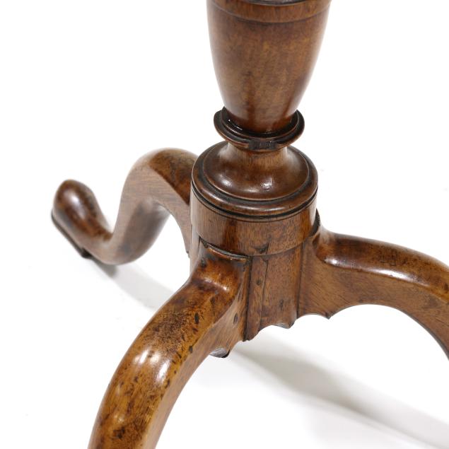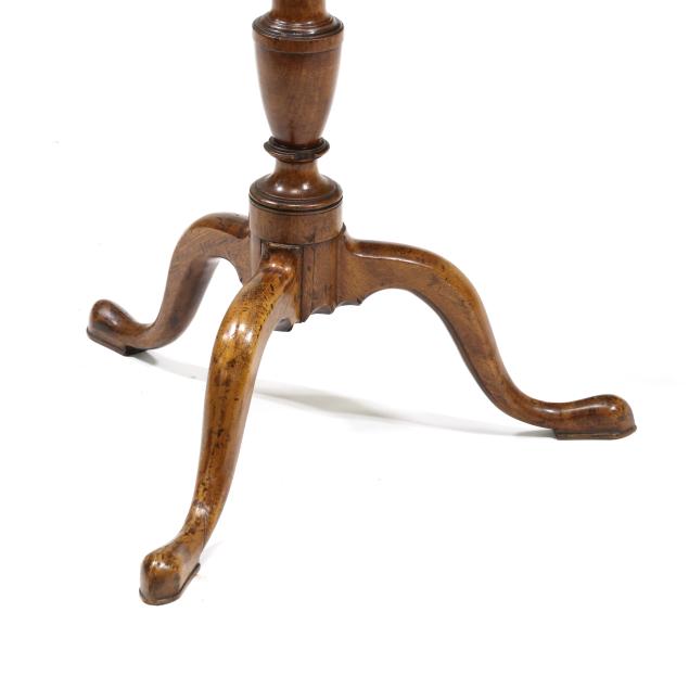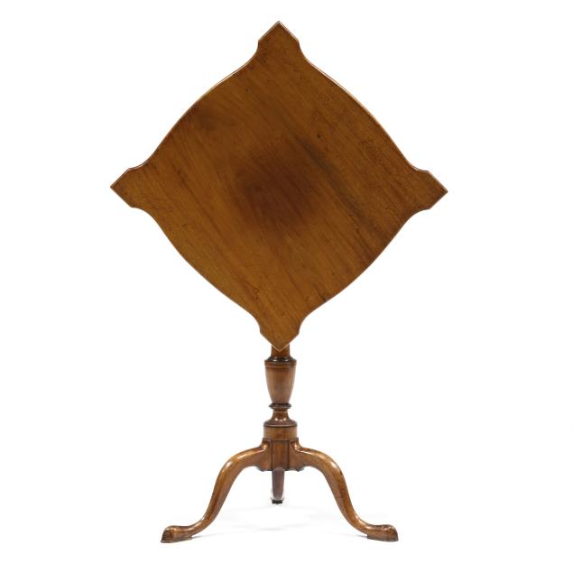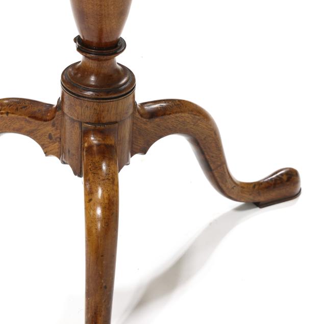 Attributed to Salem, circa 1770-1790, single board serpentine top with square corners, block and batten support, ring and urn turned standard, tripod base with arched knees with arched returns, snake pad feet.