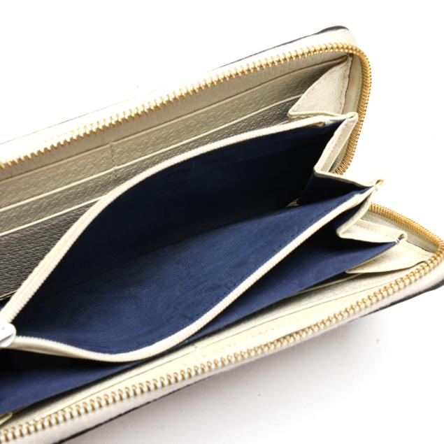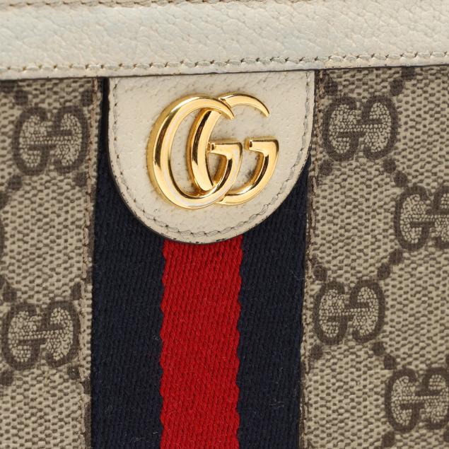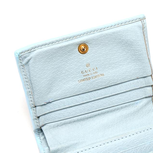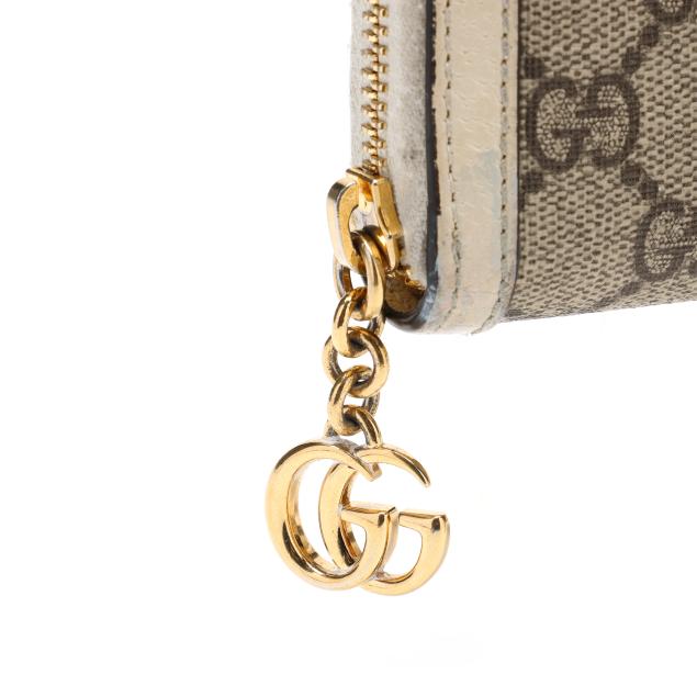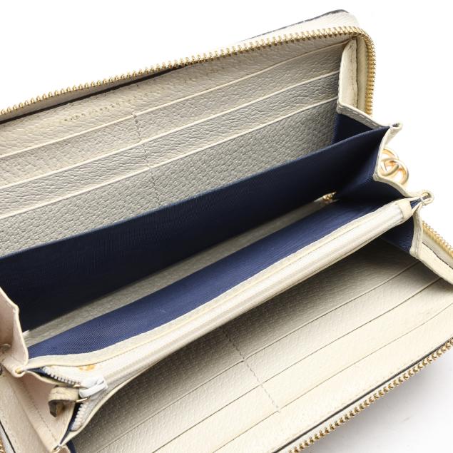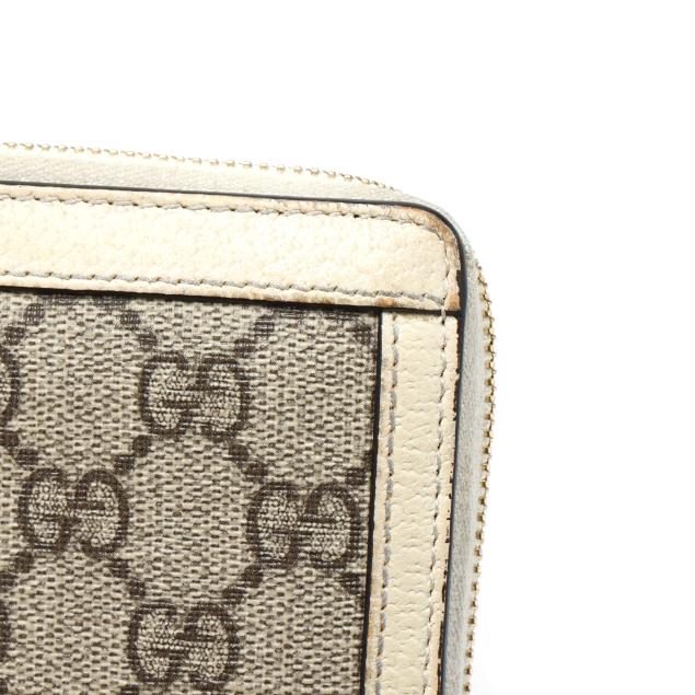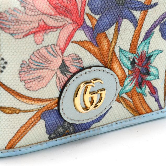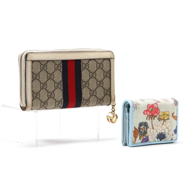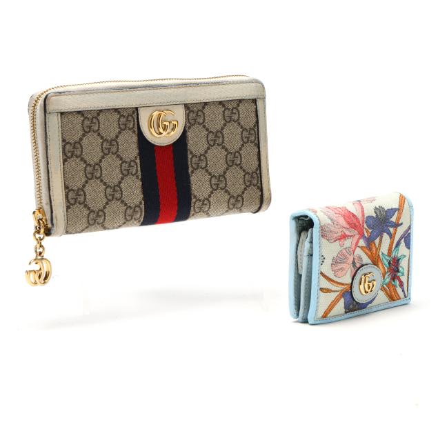 To include: a Ophidia GG Supreme zip around wallet in GG canvas with leather trim, blue-red-blue stripe, GG logo, and zipper with GG charm pull, the interior in leather with (3) main sections, (12) card slots, and a zipper pouch (4 x 7.5 x 1 in.) (discoloration and scuffing to leather exterior; loss to plating on hardware); and a bi-fold wallet in GG Flora canvas with blue leather trim and GG logo snap, opening to main cash pocket, (4) card slots, (2) pockets, and a zip pocket, marked made in Italy and Limited Edition (3.25 x 4.25 x 1 in.) (loss of color to leather).