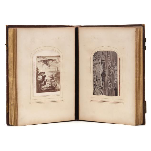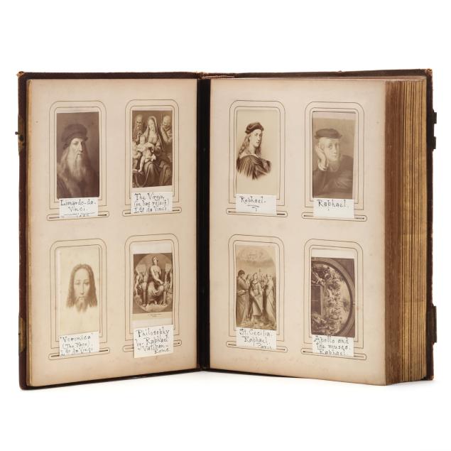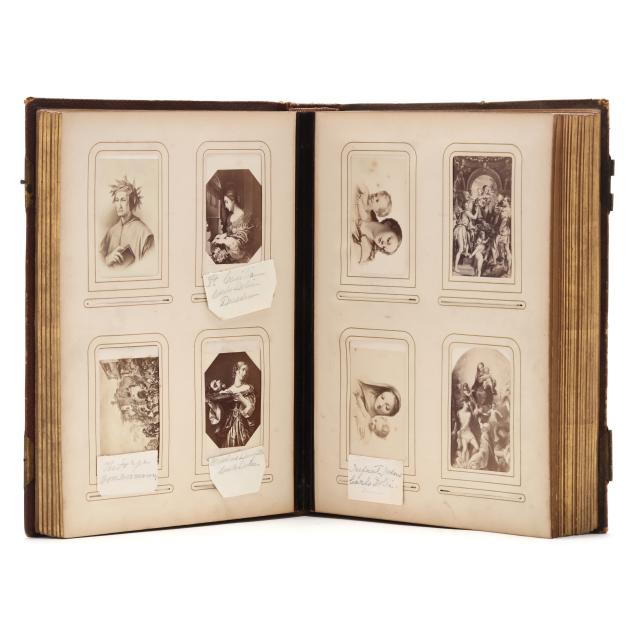 The deeply tooled leather-bound album, circa 1890, is a small quarto with gilt edges; it contains (116) CDVs and (7) cabinet cards that variously feature Renaissance painters, celebrated individuals, religious themes and historical events. Many of the images are identified on slips of paper by an early 20th century hand.
