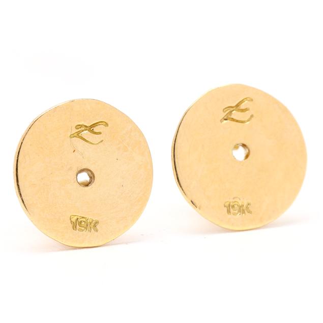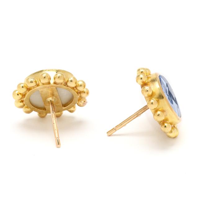 Stud earrings with center blue Venetian glass intaglio depicting a seated ram with mother-of-pearl backing, bezel set in a frame with bead detailing, completed with posts and push backs, backs with maker's mark and stamped 19K, XRF testing 19KT.