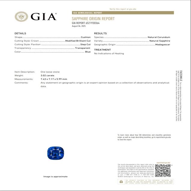 With GIA report stating Natural Corundum / Natural Sapphire with no indications of heating and geographic origin of Madagascar.