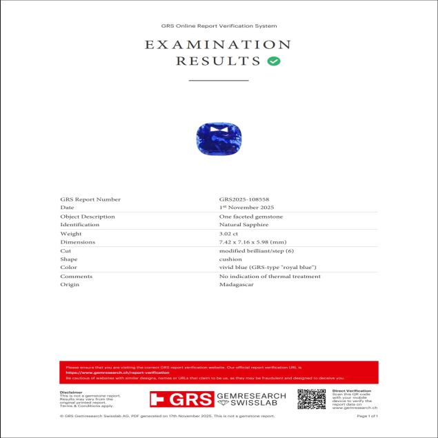 With GRS report stating Natural Sapphire with no indication of thermal treatment and geographic origin of Madagascar.