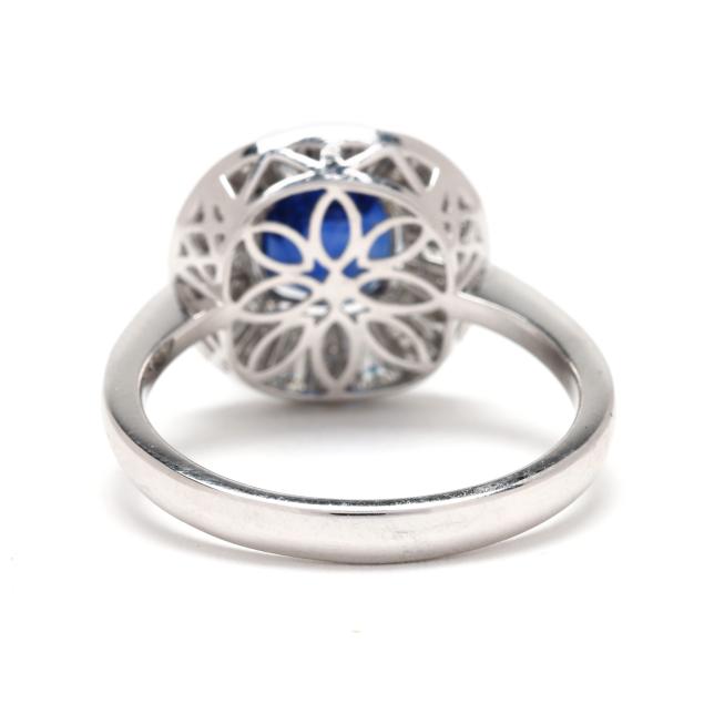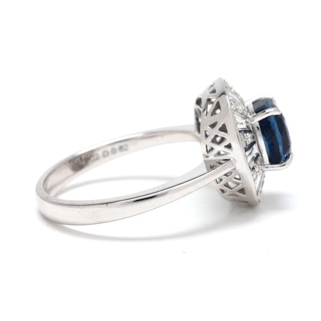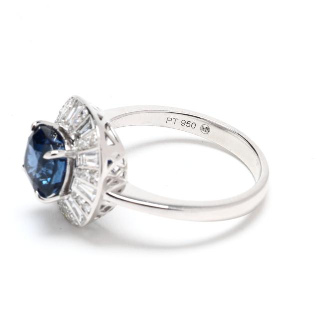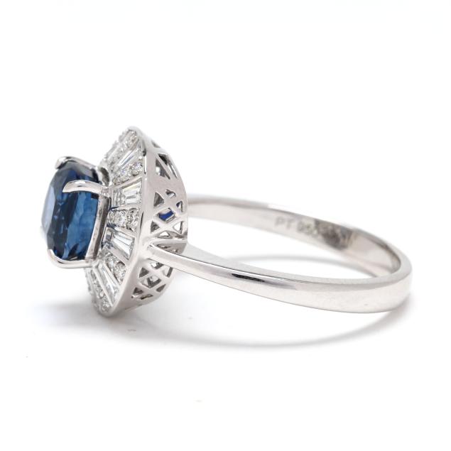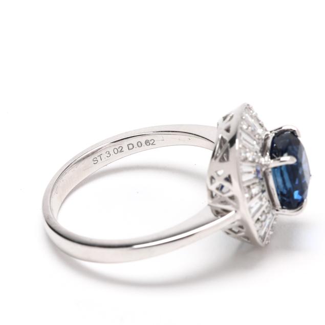 centered on a cushion cut sapphire (7.43 x 7.17 x 5.99mm) weighing 3.02 carats (actual), set within a surround of full cut round and baguette cut diamonds weighing .62 carat (F-G color, VS1-VS2 clarity), stamped PT950 / ST.3.02 D.0.62 and with a maker's mark.