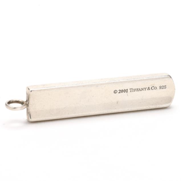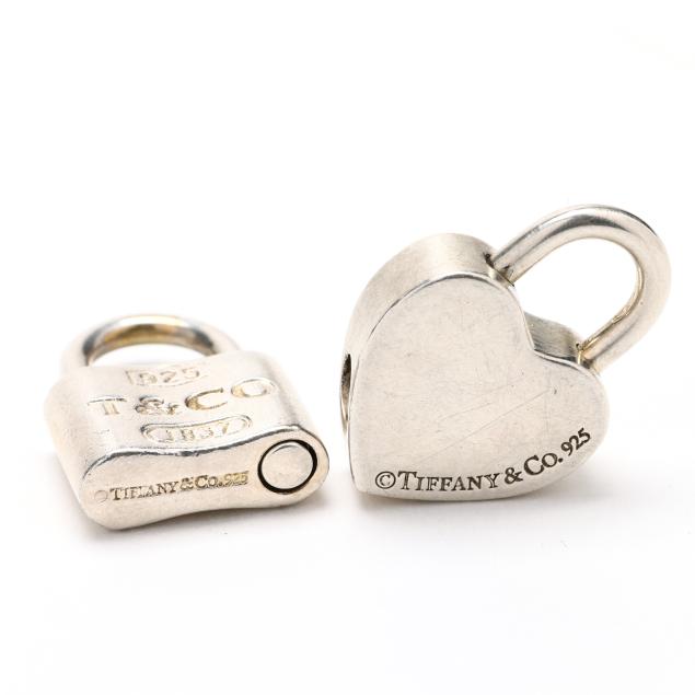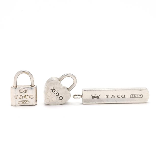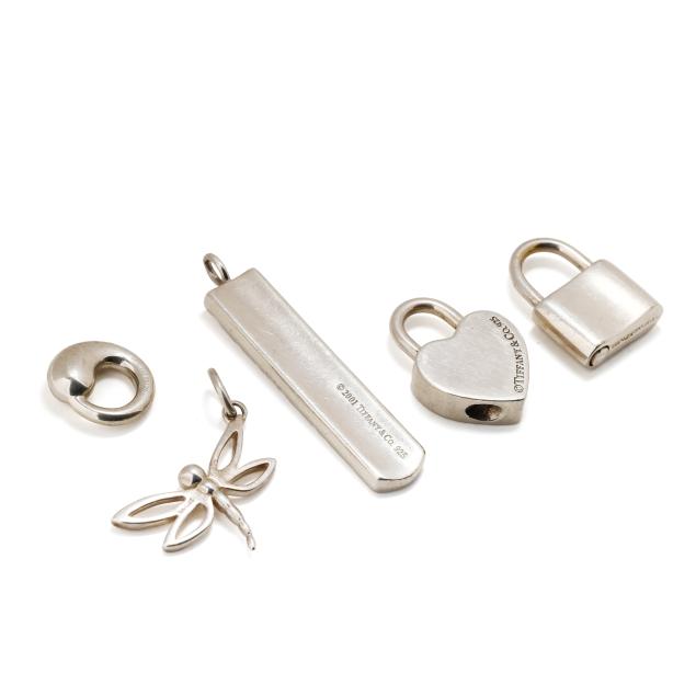 Eternal Circle charm by Elsa Peretti, with partial signature and stamped 925 Spain (.5 in.); a lock charm, signed and stamped 925 (.75 in.); a heart shaped lock charm, signed and stamped 925 (7/8 in.); a butterfly charm, signed and stamped 925 (1 1/8 in.); and a bar pendant, signed and stamped 2001 / 925 (1.75 in.).