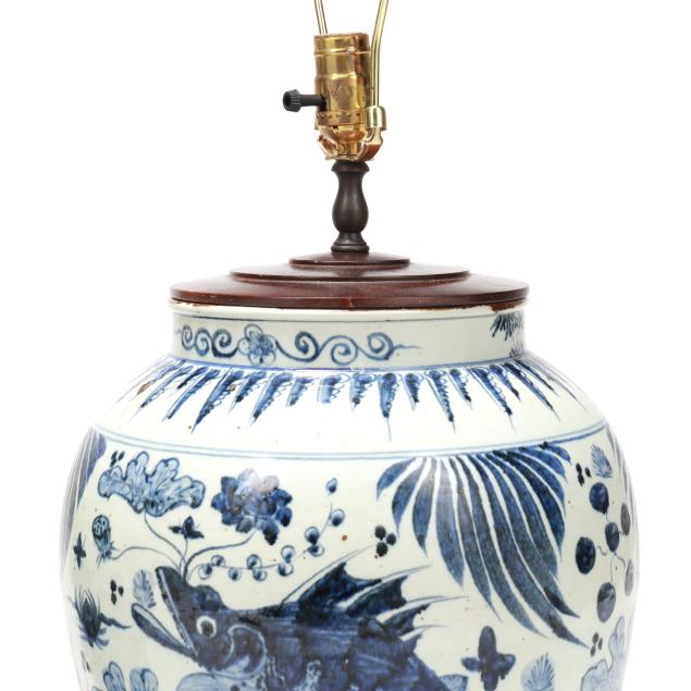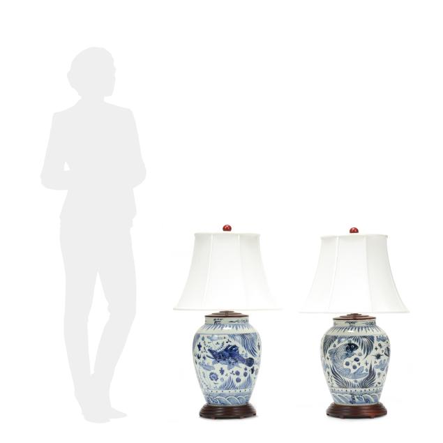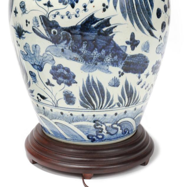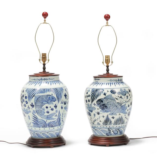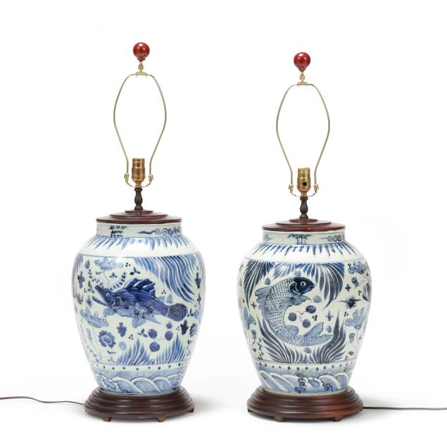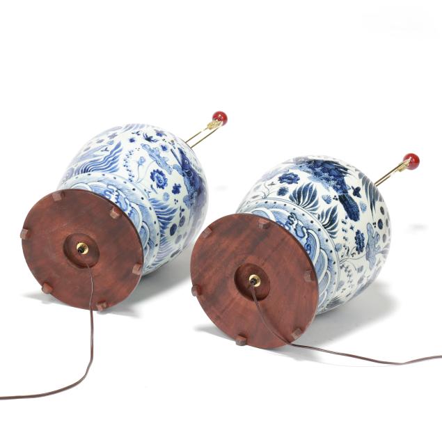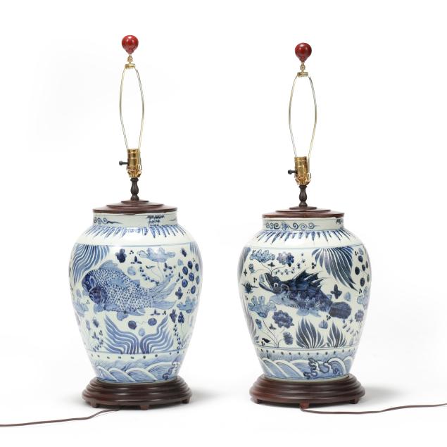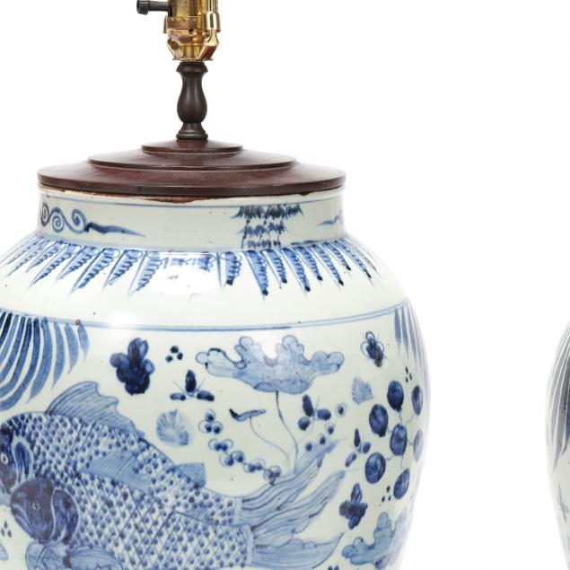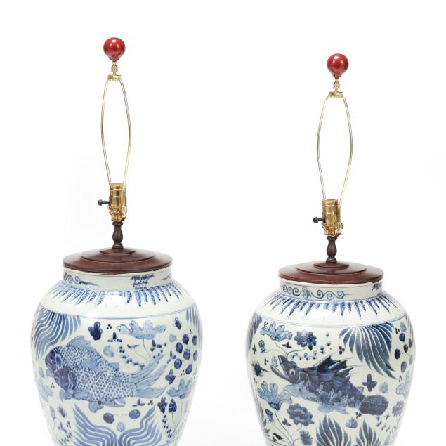 19th century, stately semi-ovoid stoneware vases, hand-painted in cobalt featuring fish, floral and insect decoration, mounted with wood bases and lids with single socket fixture.