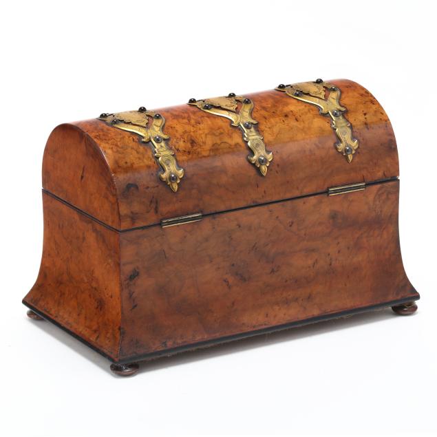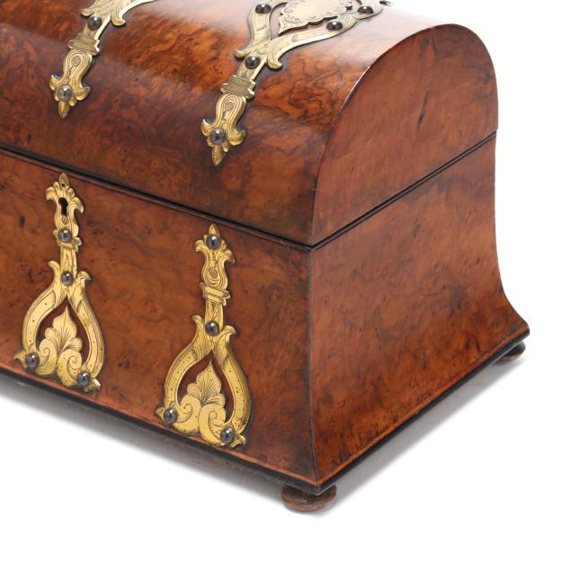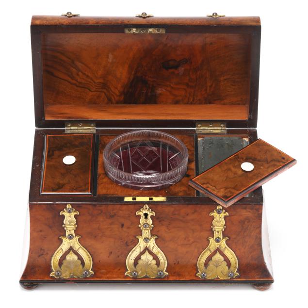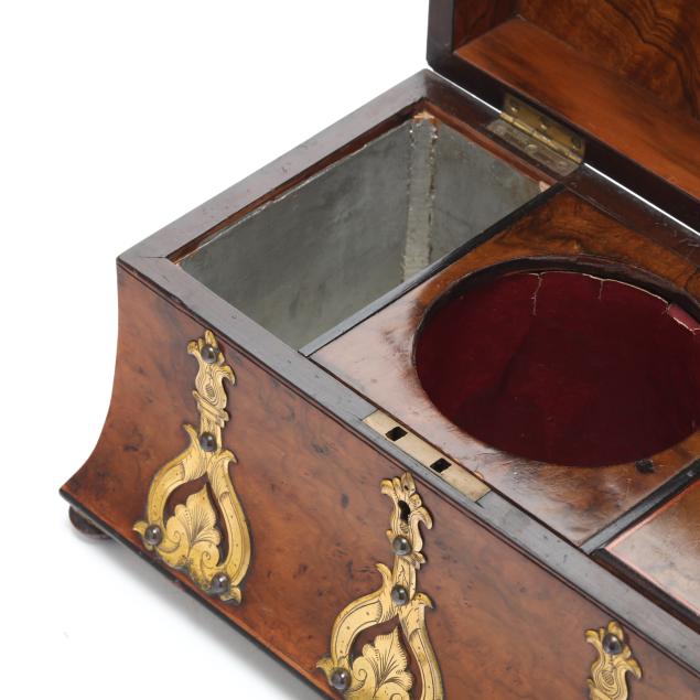 England, mid 19th century, walnut veneers with light and dark edge inlays, vaulted hinged lid over a spreading rectangular base, decorated in ornate chased and riveted brass foliate plume mounts, opens to twin hinge-lidded and lined tea compartments, flanking a central mixing glass. raised on compressed bun feet.