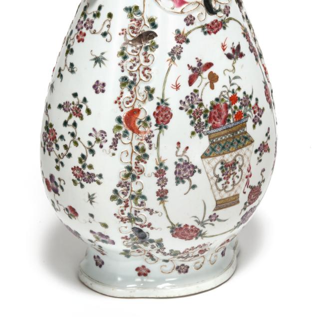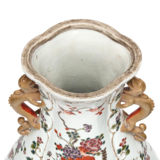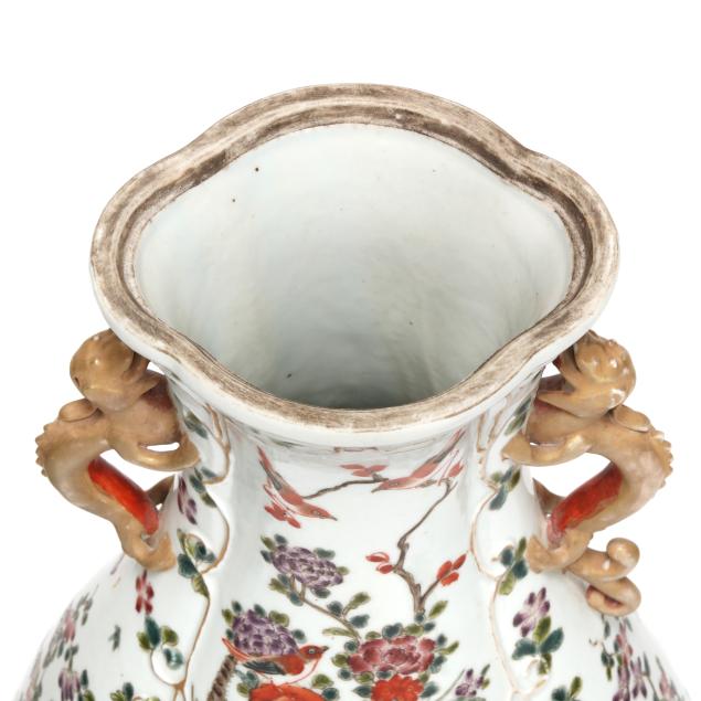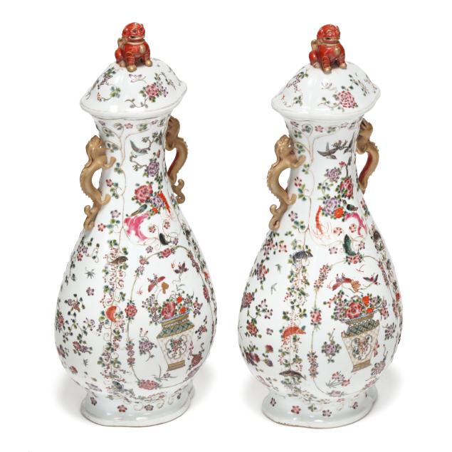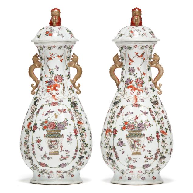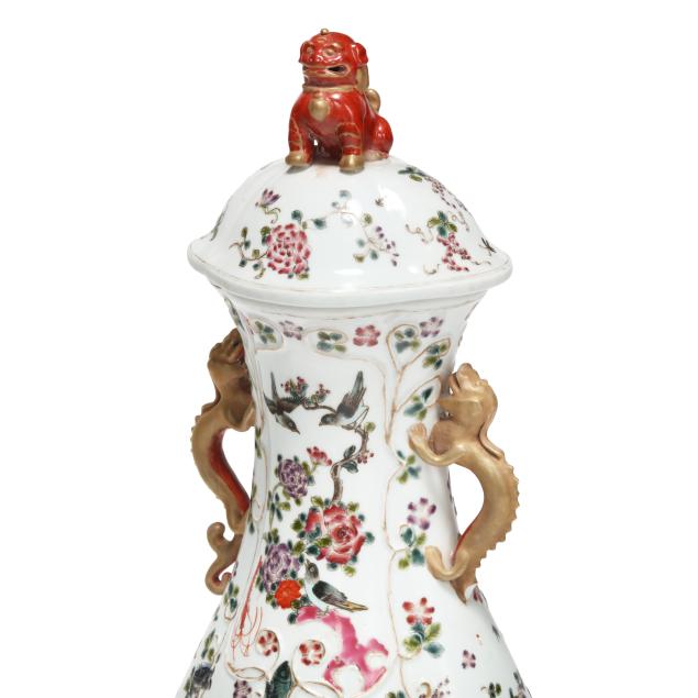 Late 19th century, hand-painted porcelain, footed lobed baluster form, conforming cover surmounted with foo lion finial, featuring hand-painted floral filled urn at center surrounded by a raised vining border, field decorated with flowers, insects, birds, fish and crustaceans against a white ground, flanked by gilt dragon form handles.