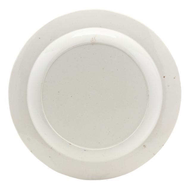 England, dated 1802, lead glazed creamware with transfer decoration and hand coloring, unmarked, featuring an patriotic spread-winged eagle with fifteen stars, with Thomas Jefferson’s first inaugural address delivered March 4, 1801: “Peace, Commerce and honest Friendship with all Nations. Entangling Alliances with none-" the rim decorated with exotic bird in landscape vignettes.