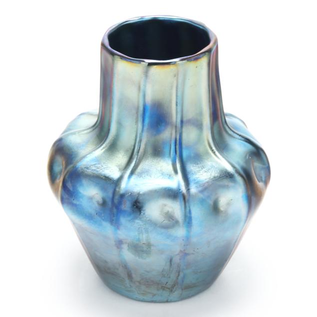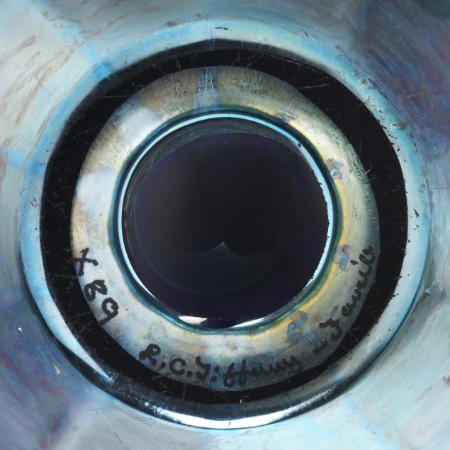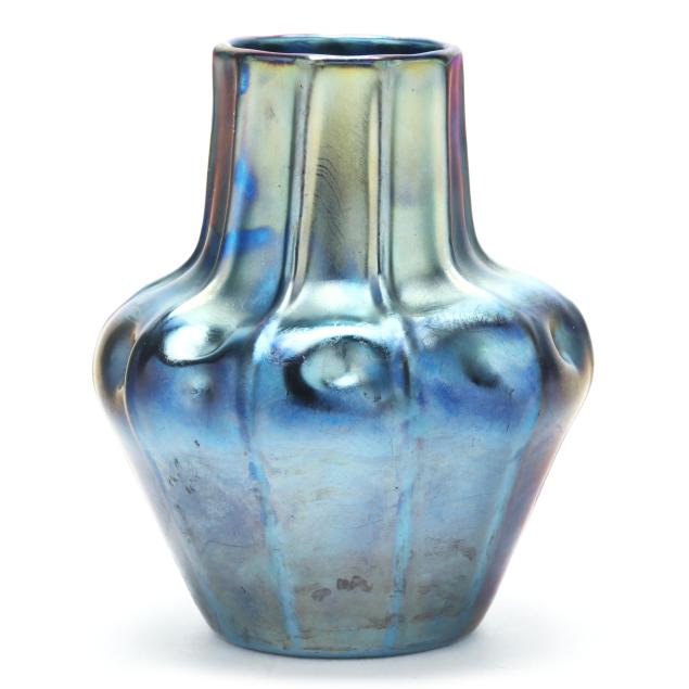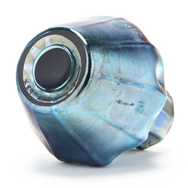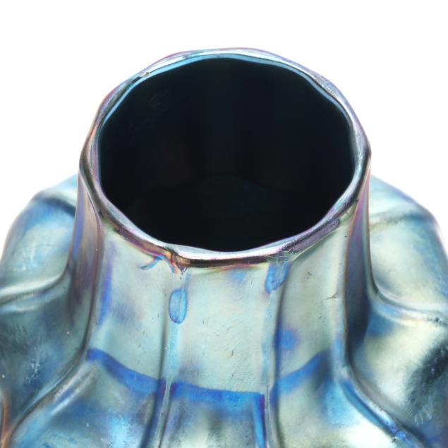 New York, circa 1910, blown cobalt glass with iridescent surface, ribbed surface with dimpled shoulder, polished pontil, signed and numbered X89.