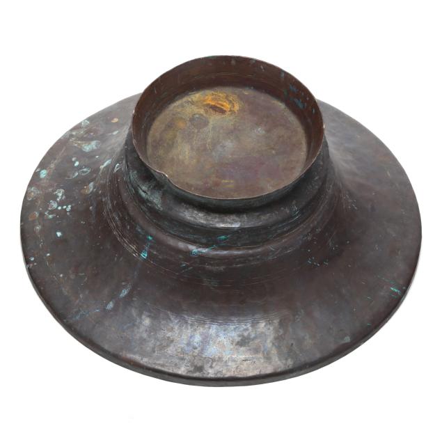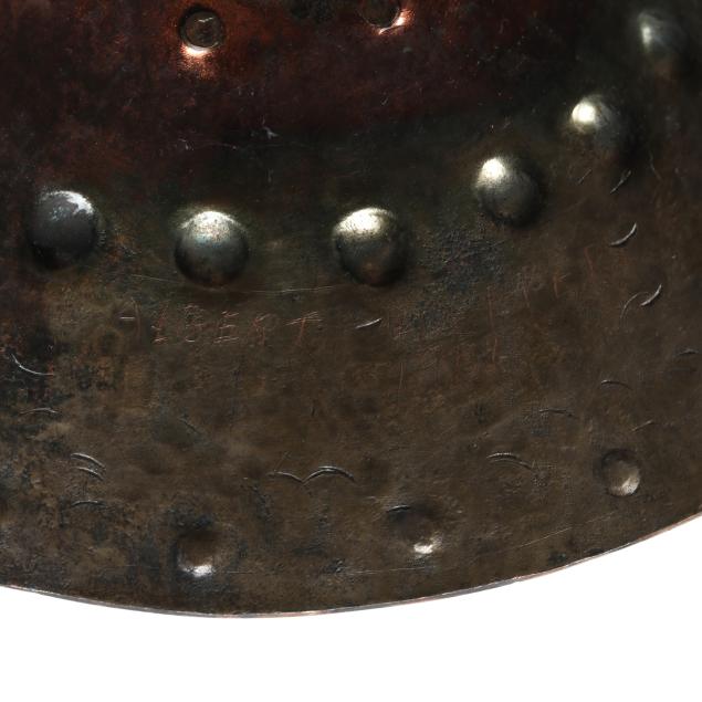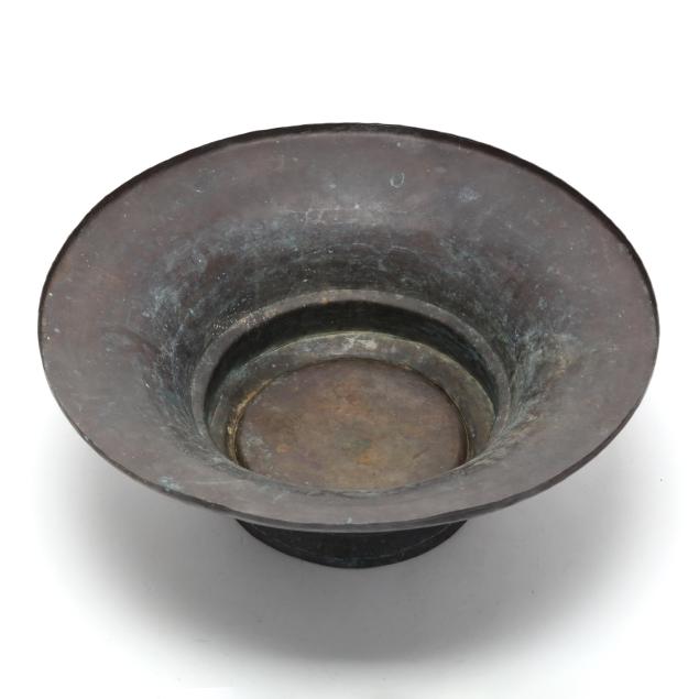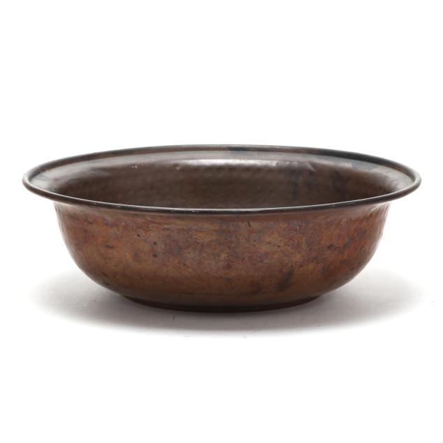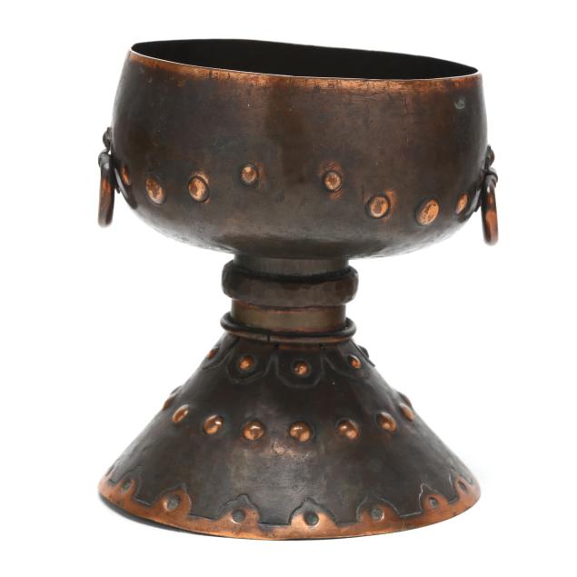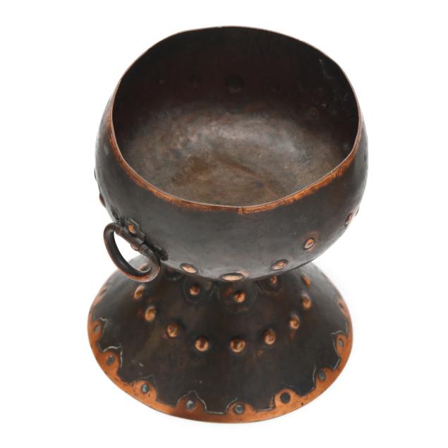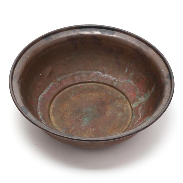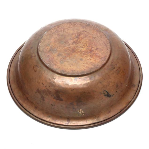 To include a hammered patinated copper goblet with two ring handles to cup, incised and applied cut copper decoration to whole, inscribed "ALBERT HEPPERT / 1906" to underside (4 1/2 x 3 7/8 in.); a footed centerpiece bowl with flared rim (15 1/4 in. diameter); and a hammered centerpiece bowl (14 5/8 in.).