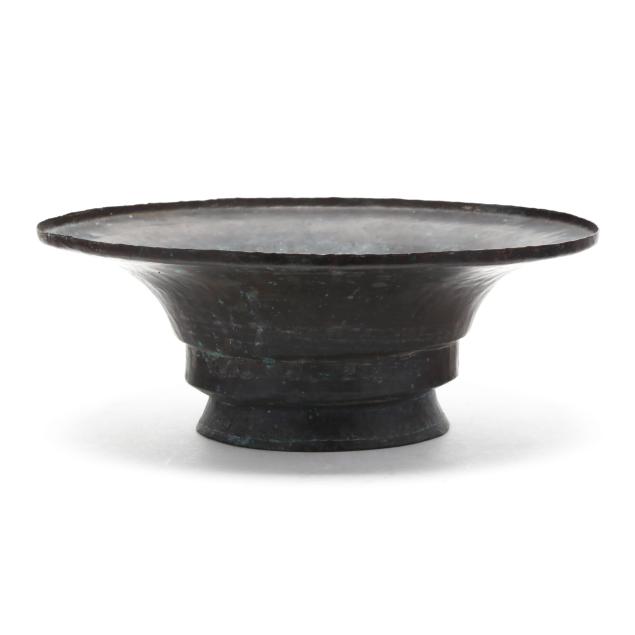 All with scattered surface marks; the footed bowl with verdigris spotting, some small dents, crack to foot; the hammered bowl with verdigris spotting and staining mainly to interior.