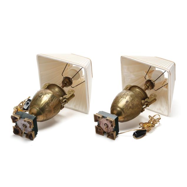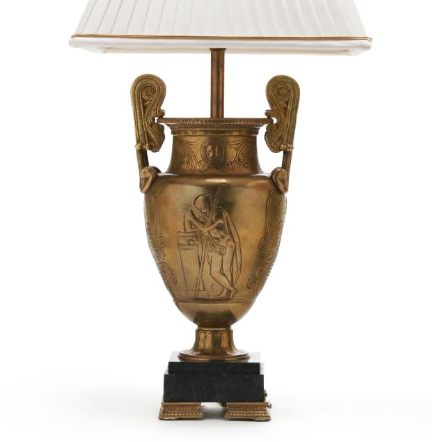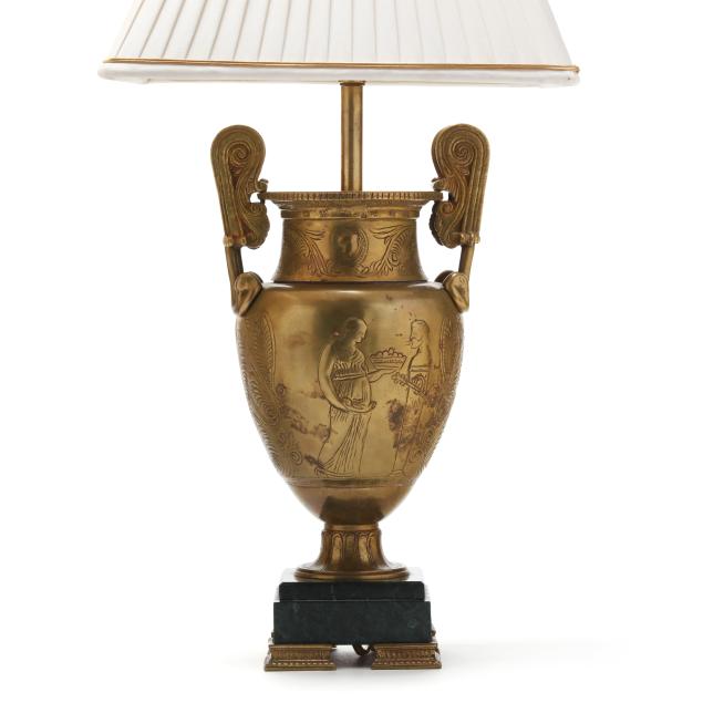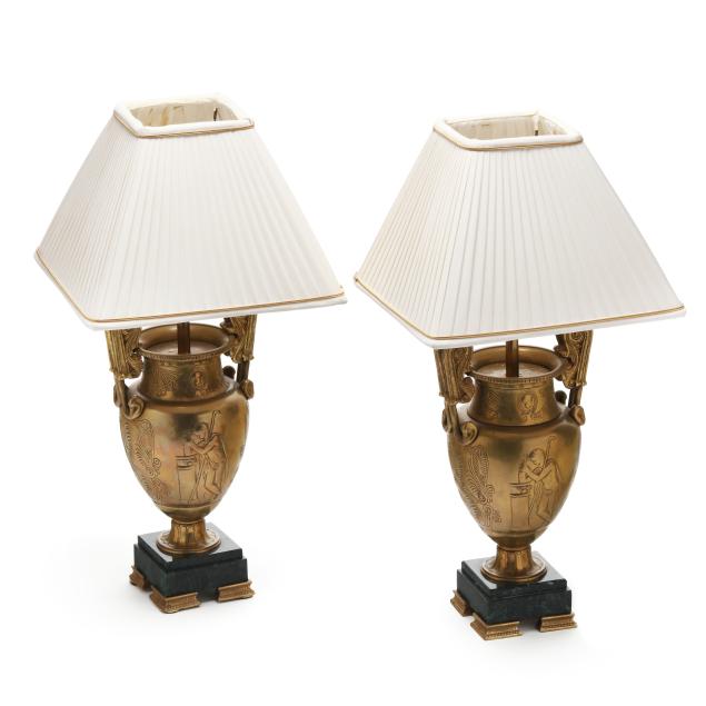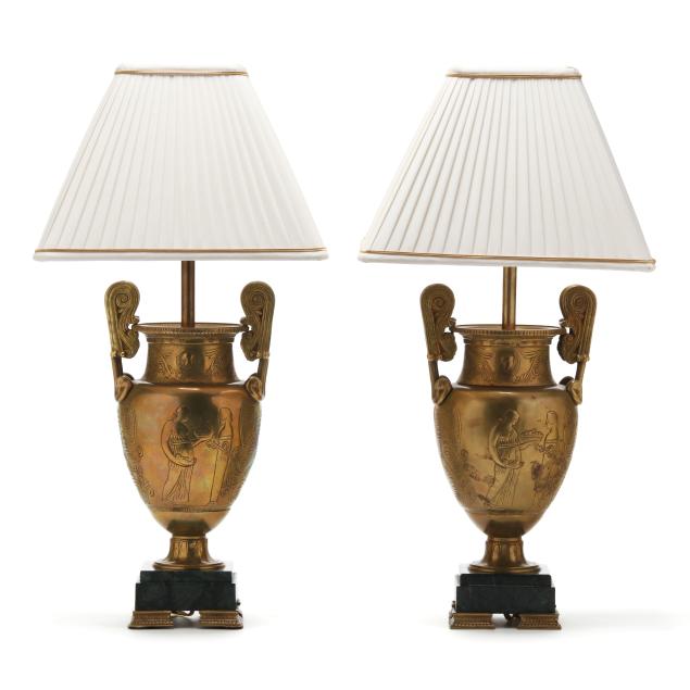 Mid- to late 20th century, both in the style of Greek amphorae with incised figures and foliate motifs to body, mounted to stepped green marble plinths atop four columnar form feet, unmarked, includes (2) square form pleated silk-lined shades and brass mounts.