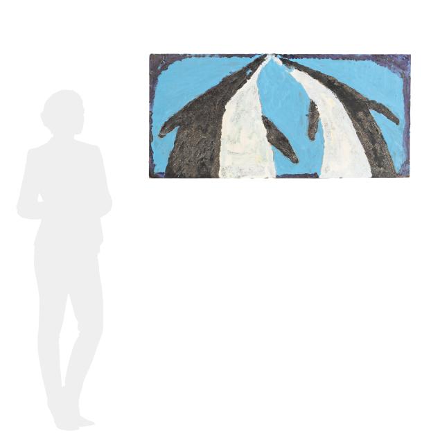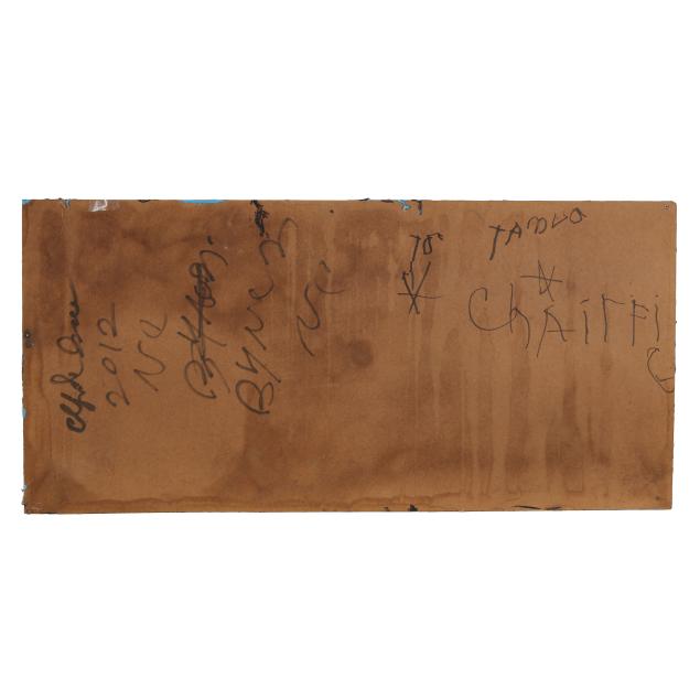 Polychrome paint and glitter on board, signed and inscribed to the verso, unframed.