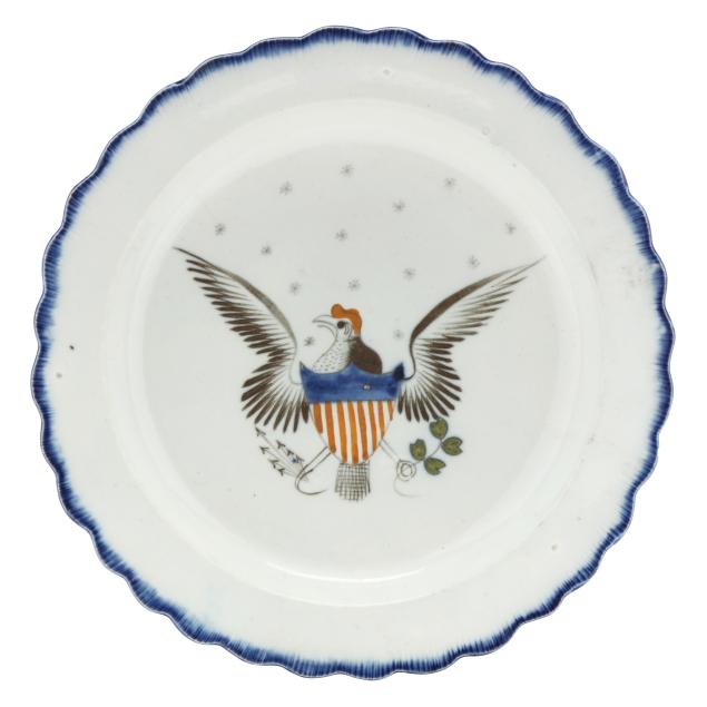 Made for the American market by Staffordshire potters circa 1810. Typical examples are executed in four or five underglaze colors. Intended for the middle and lower classes, these patriotic dishes were not merely decorative but also much used on the table. Eagle-decorated plates are sometimes found in archaeological excavations, further confirming their intended use as functional tableware.