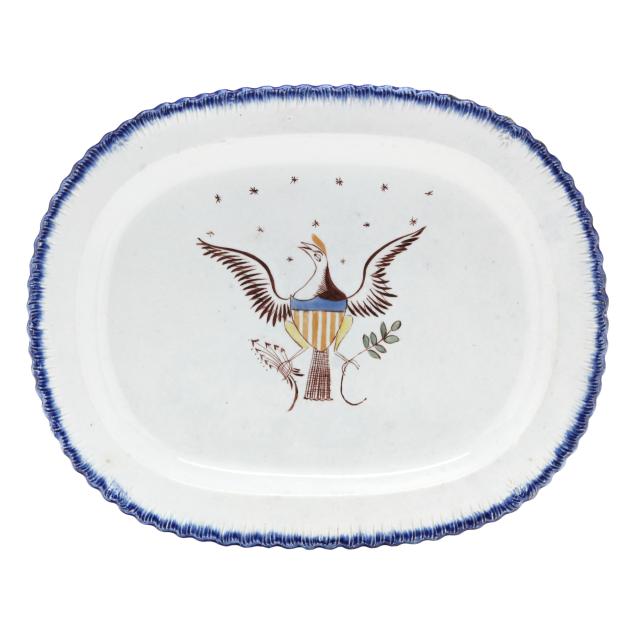 Staffordshire, England, early 19th century, each centering a hand-painted image of America's eagle and shield seal, the platter decorated with (12) stars, impressed mark "B / WOOD" to underside (12 1/2 x 15 1/2 in.); a round plate with (14) stars, impressed heart to the underside (9 3/4 in.)