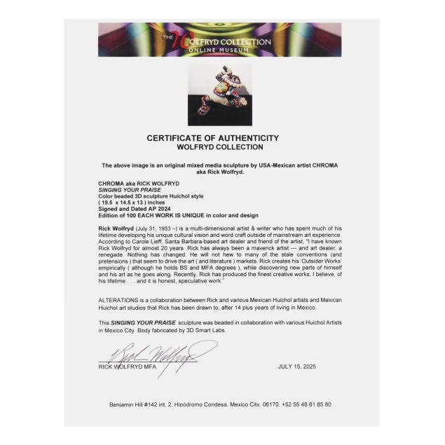 2025, Artist Proof from an edition of 100, ink signed with edition number and dated to the underside, Huichol style color beaded 3D, uniquely colored and designed in collaboration with various Huichol artists in Mexico city. Included with the Lot is a signed certificate of authenticity by the artist.