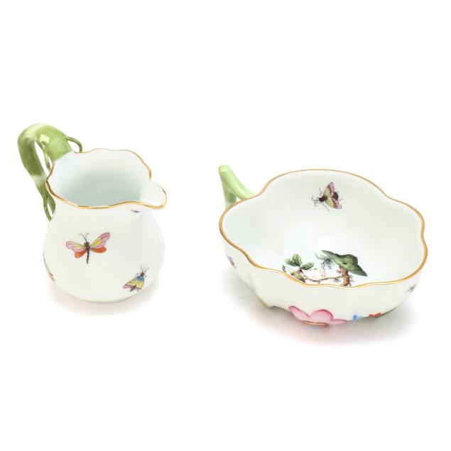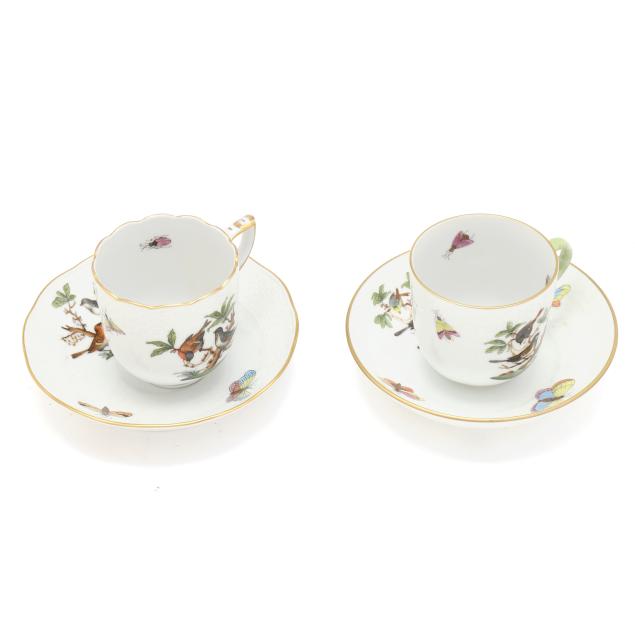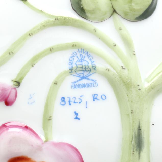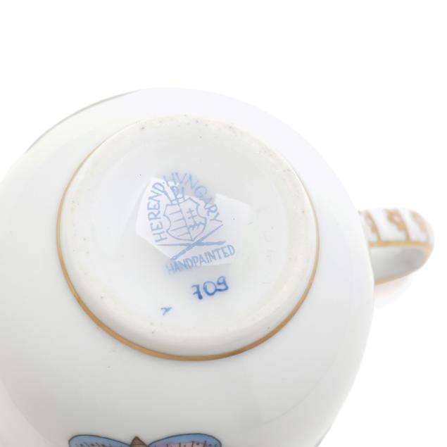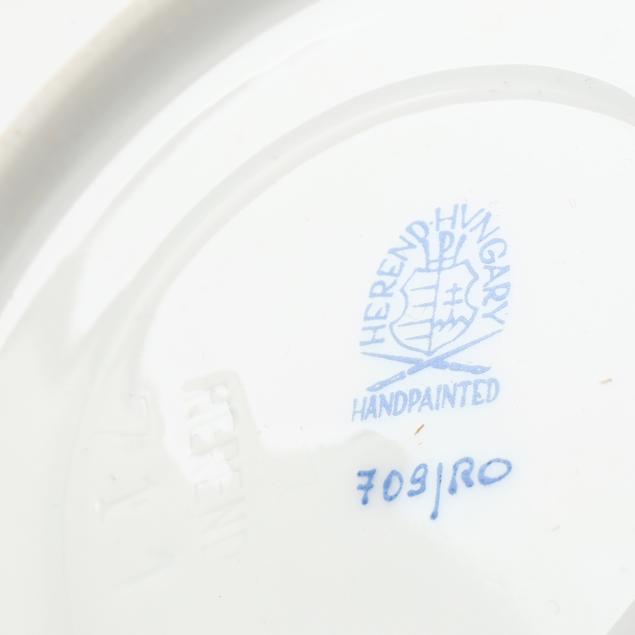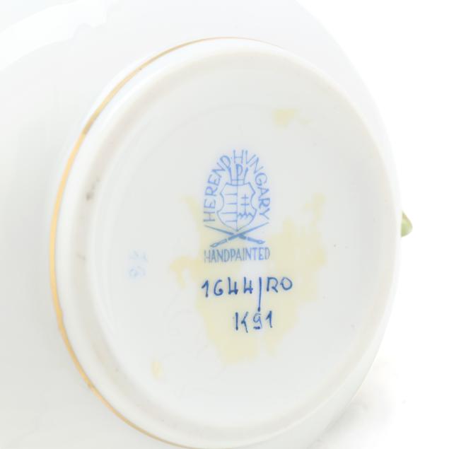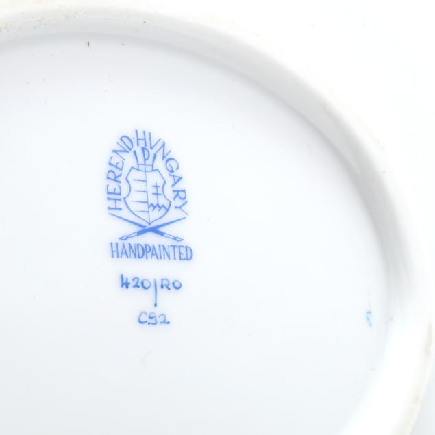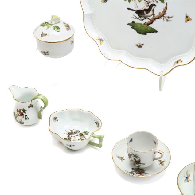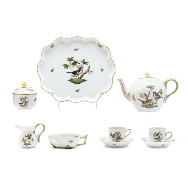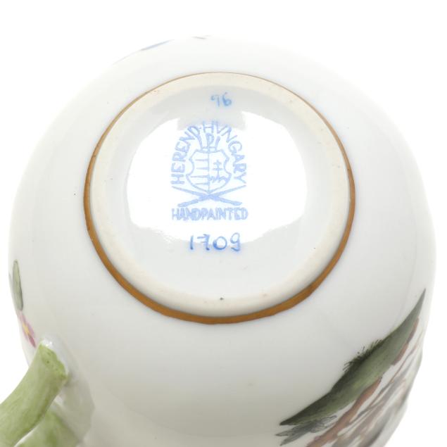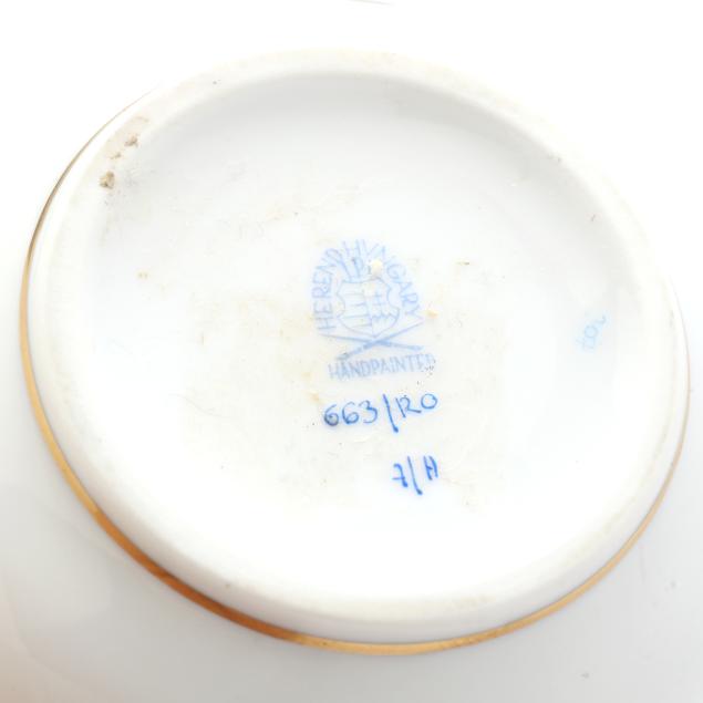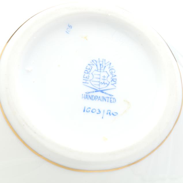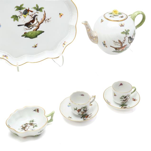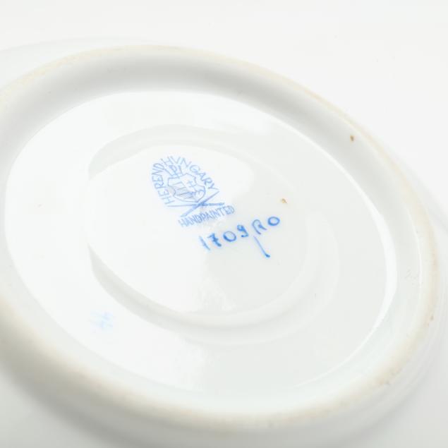 Hungary, hand-painted and gilt porcelain, (9) pieces to include: an oblong tray #420 (11 1/4 x 9 5/8 in.); a lidded teapot #1603 (5 3/4 x 5 1/2 x 9 in.); a mini creamer #1644 (2 7/8 x 3 x 4 in.); a mini lidded sugar #663 (4 x 3 1/2 x 3 1/2 in.); and a leaf dish #8725 (5 3/8 x 4 1/8 x 1 1/2 in.); a #1709 flat demitasse cup (2 3/8 x 2 1/4 x 3 in.) and saucer set (2 1/2 in.); and a #709 flat demitasse cup (2 1/4 x 2 3/8 x 3 1/4 in.) and saucer set (2 3/8 in.), all marked with company backstamp to underside.