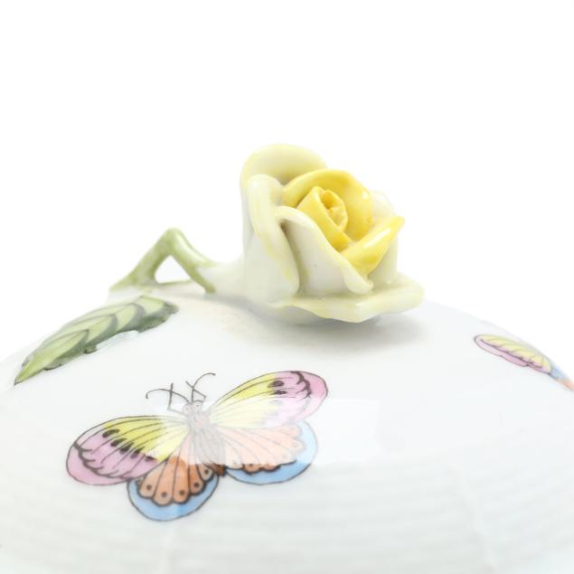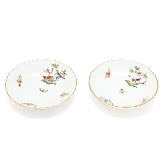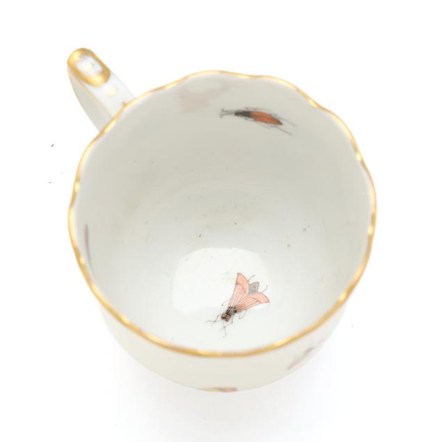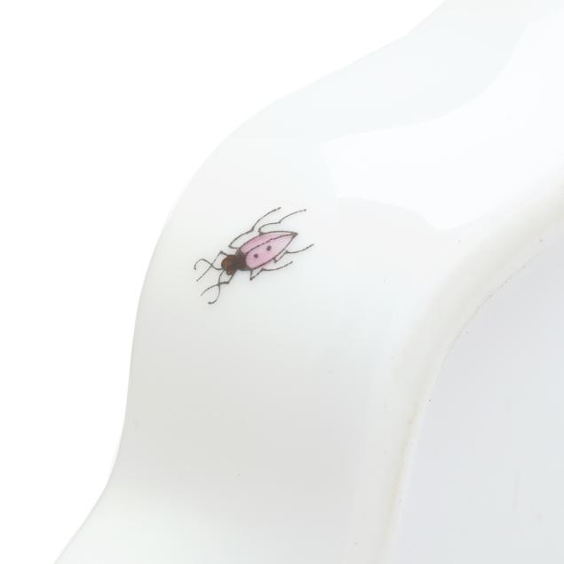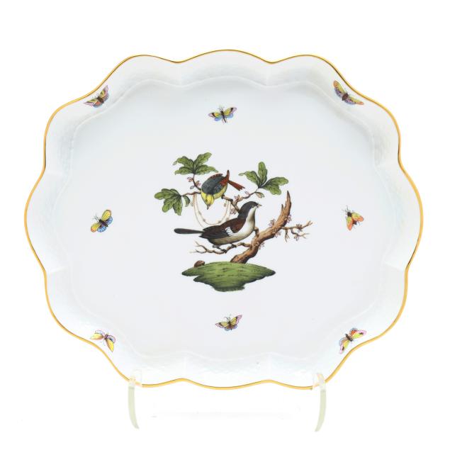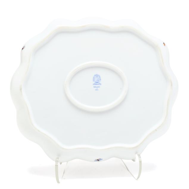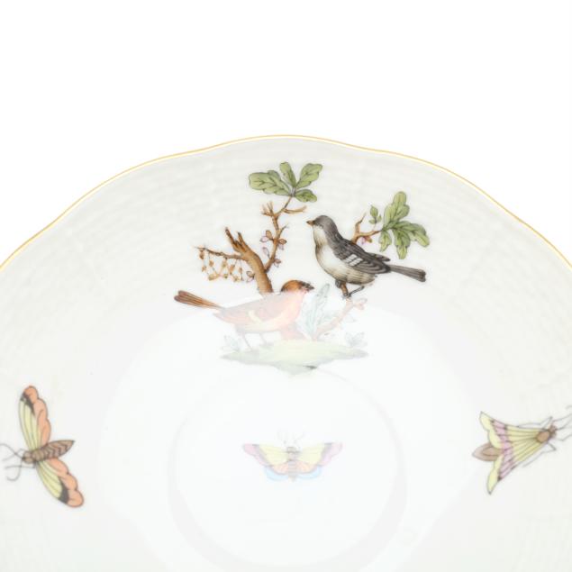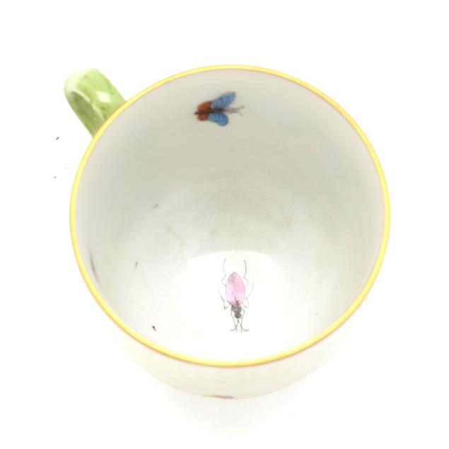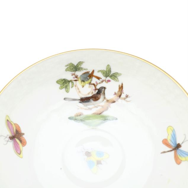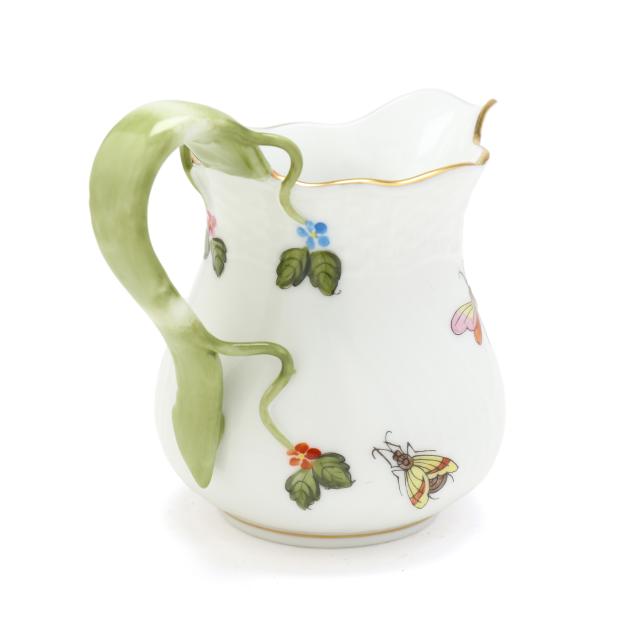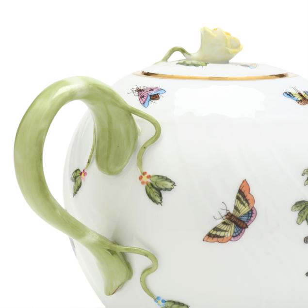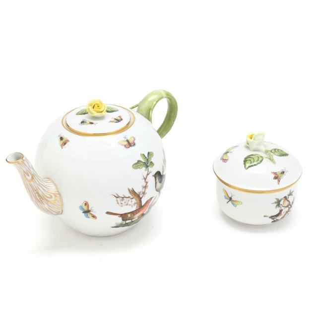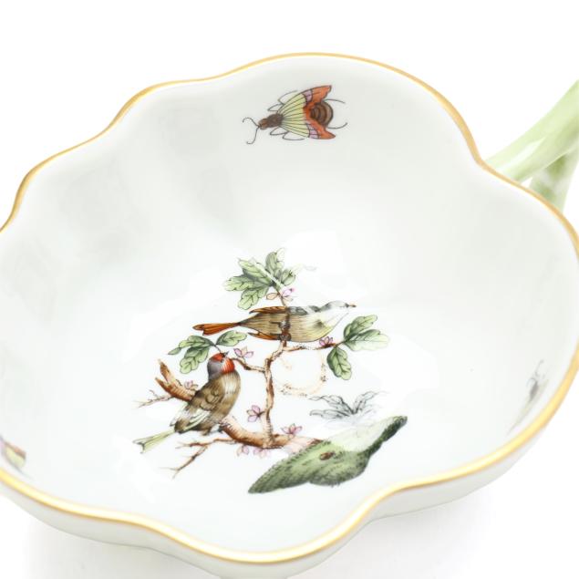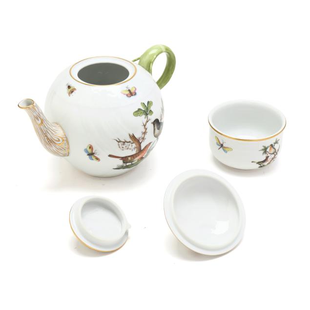 Hungary, hand-painted and gilt porcelain, (9) pieces to include: an oblong tray #420 (11 1/4 x 9 5/8 in.); a lidded teapot #1603 (5 3/4 x 5 1/2 x 9 in.); a mini creamer #1644 (2 7/8 x 3 x 4 in.); a mini lidded sugar #663 (4 x 3 1/2 x 3 1/2 in.); and a leaf dish #8725 (5 3/8 x 4 1/8 x 1 1/2 in.); a #1709 flat demitasse cup (2 3/8 x 2 1/4 x 3 in.) and saucer set (2 1/2 in.); and a #709 flat demitasse cup (2 1/4 x 2 3/8 x 3 1/4 in.) and saucer set (2 3/8 in.), all marked with company backstamp to underside.