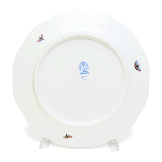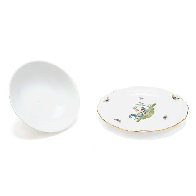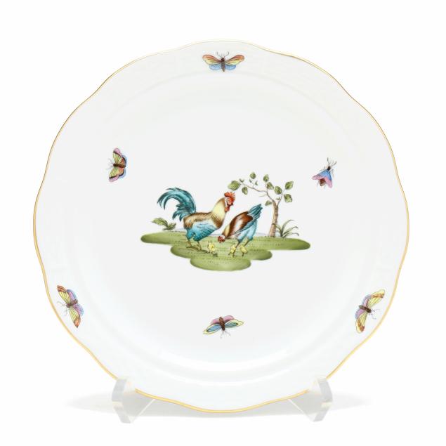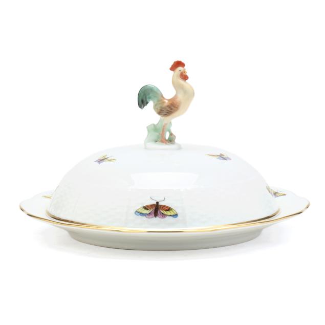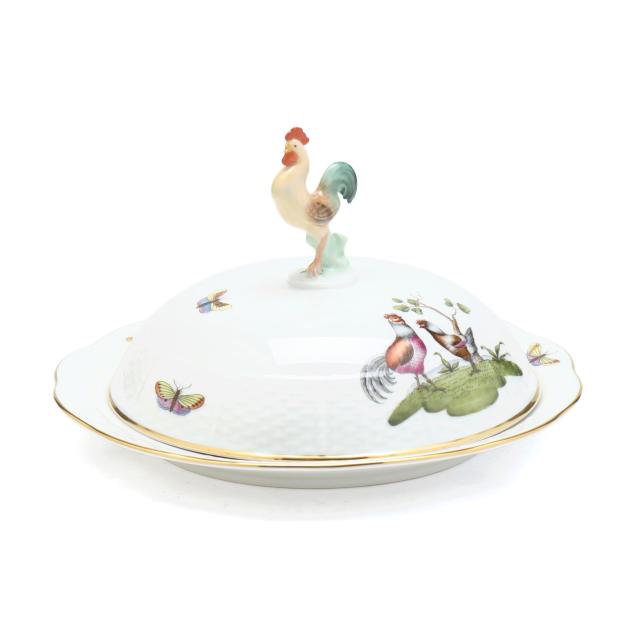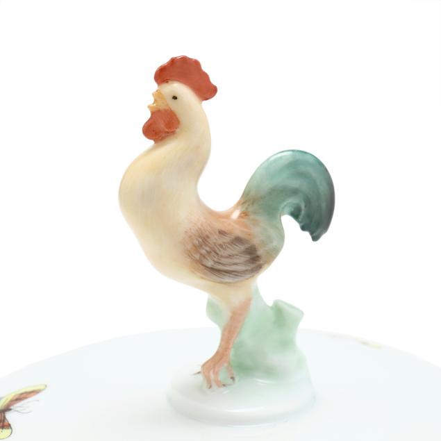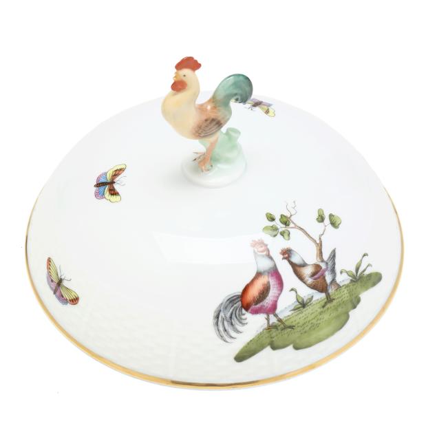 Hungary, hand-painted and gilt porcelain, #75 muffin dish and lid with rooster finial, marked with company backstamp to underside.