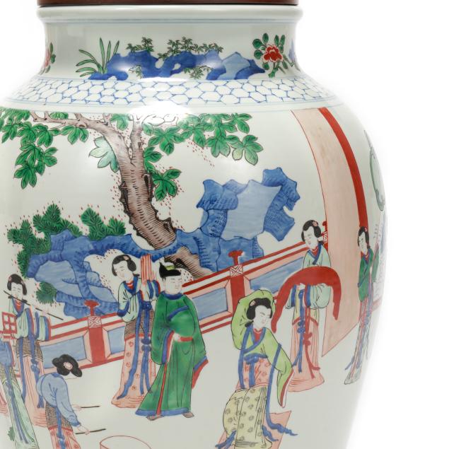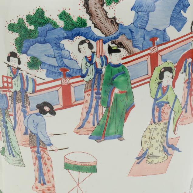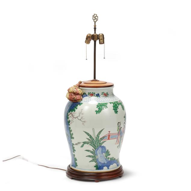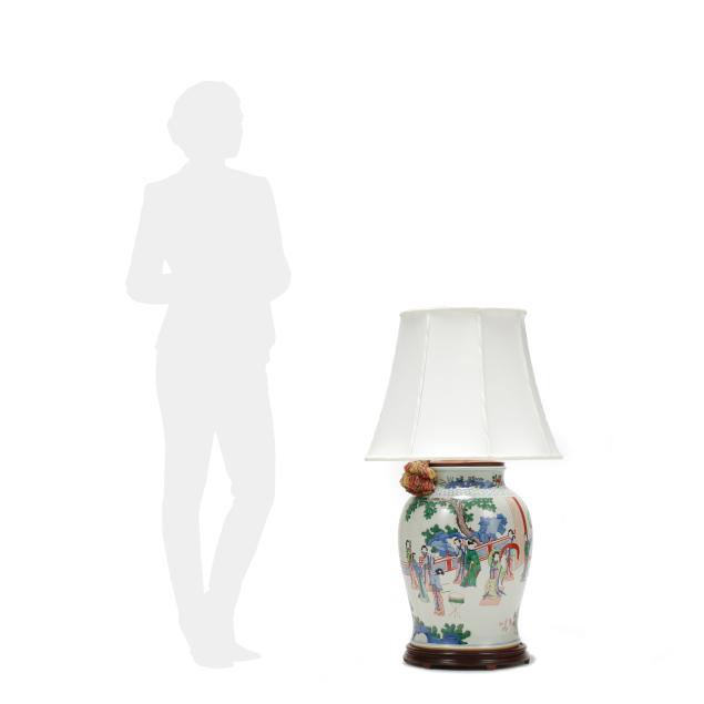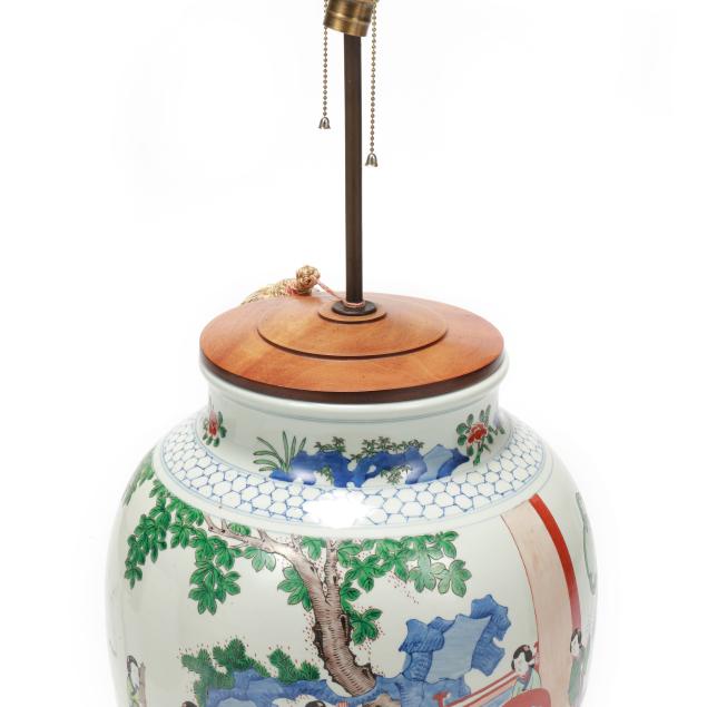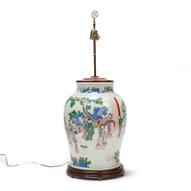 20th century, hand painted porcelain, depicting a several figures including musicians gathered in a garden against a white ground, now mounted as a table lamp with wooden base and cap, single socket fixture with silk shade.