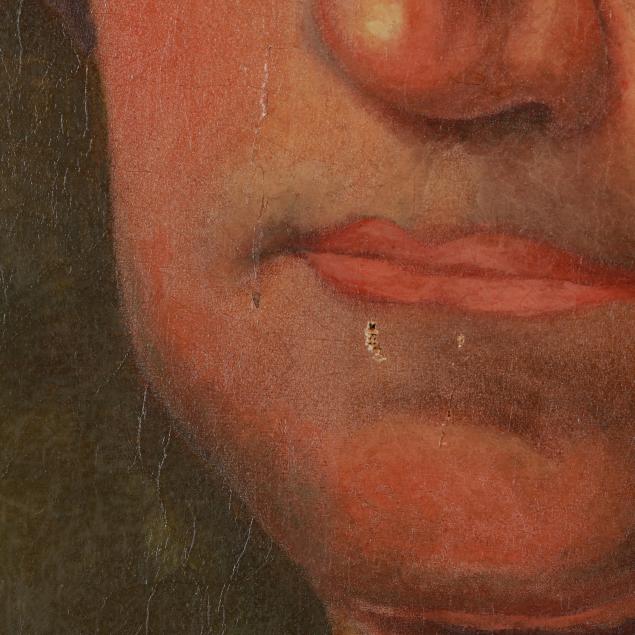 Age cracking, large areas of buckling to canvas with associated flaking to the lower edge, retouching, and scattered losses.
