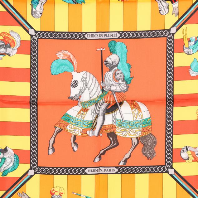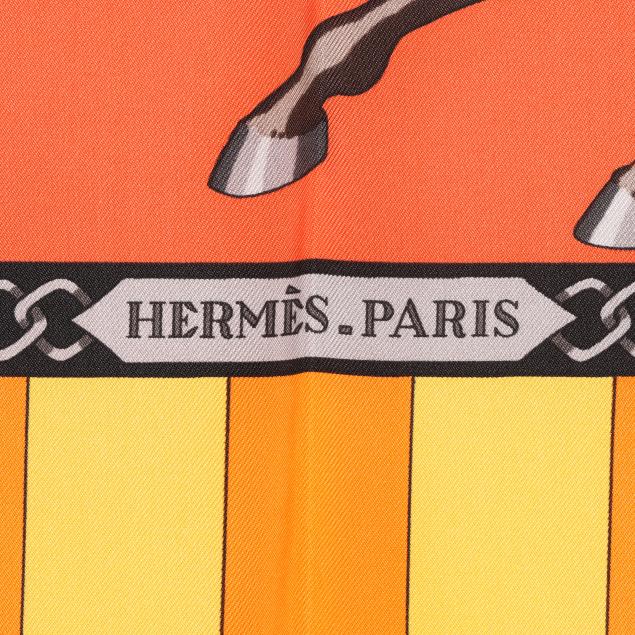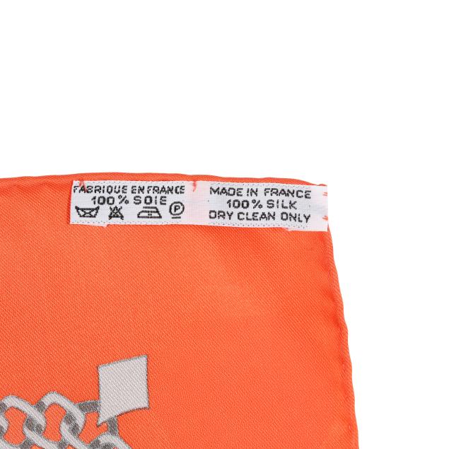 Designed by artist Christiane Vauzelles, the silk twill with rolled and hand stitched edges, with a color palette of orange, yellow, and green, and with care tag stating made in France.