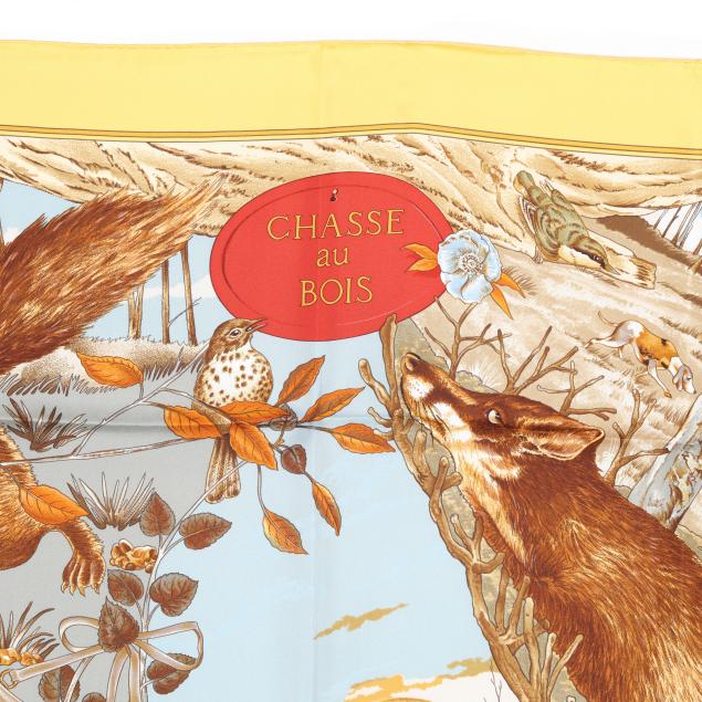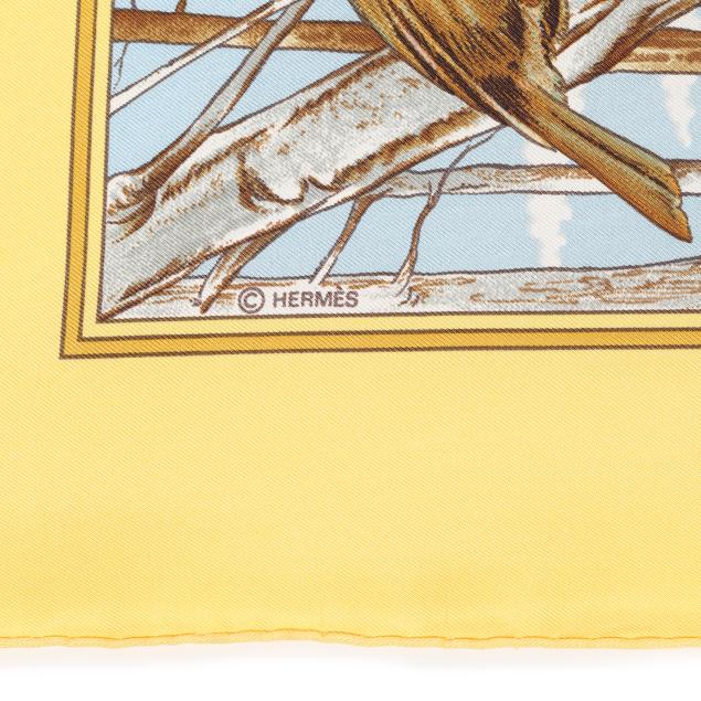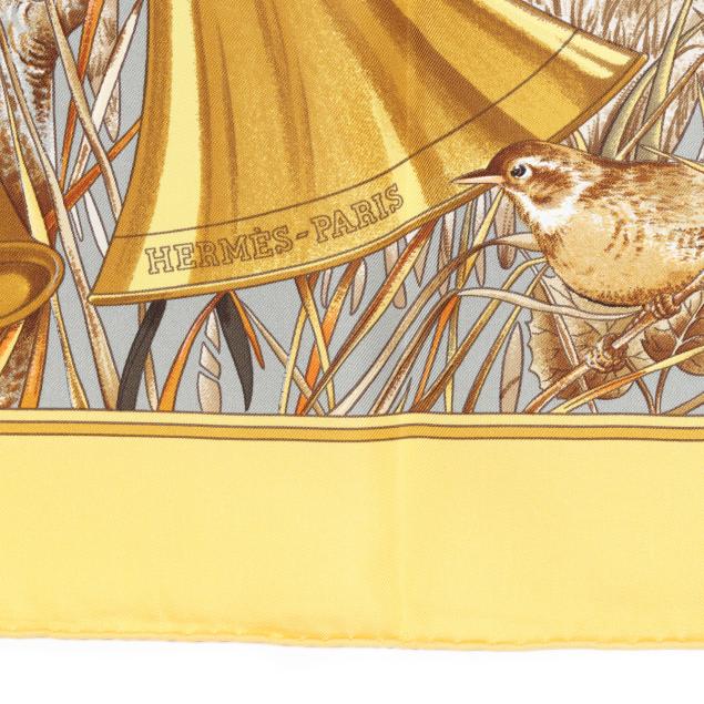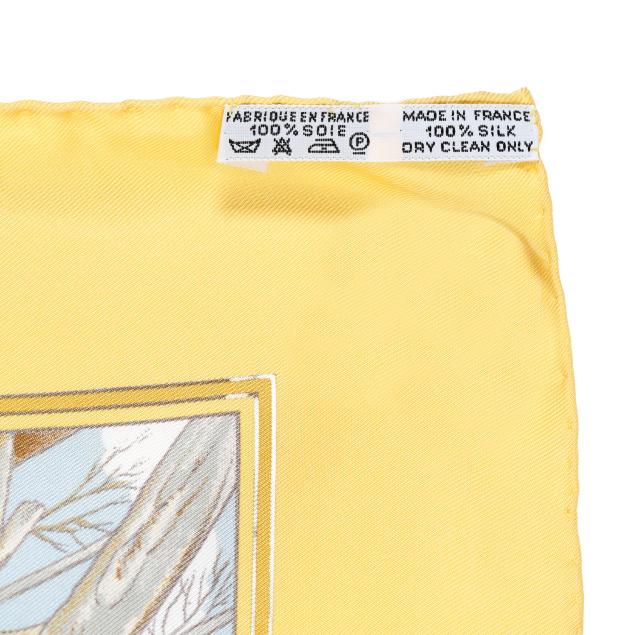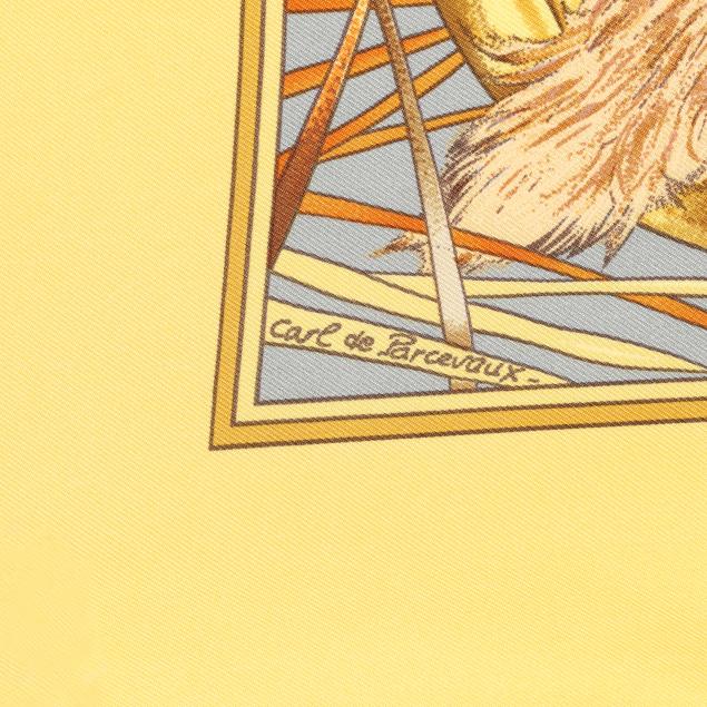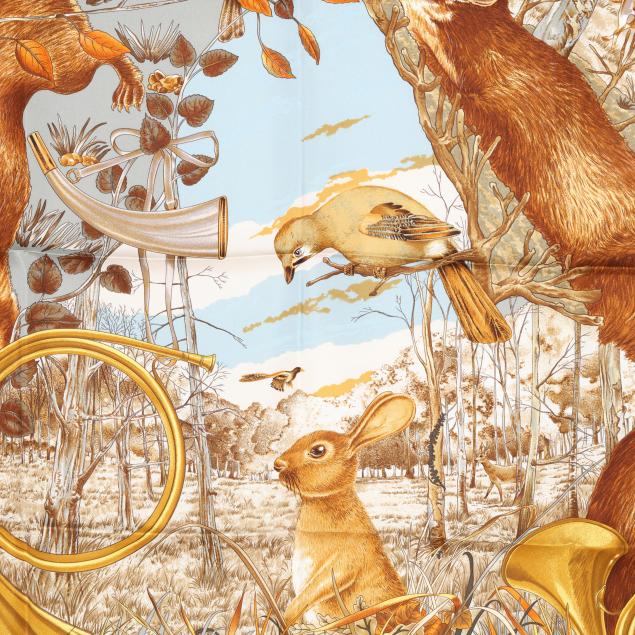 Designed by artist Carl de Parcevaux, the silk twill with rolled and hand stitched edges, with a color palette of gold, brown, and blue, and with care tag stating made in France.