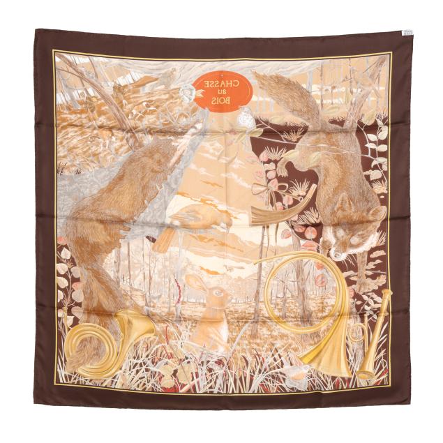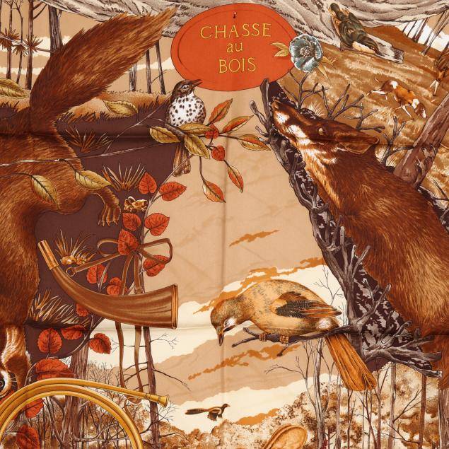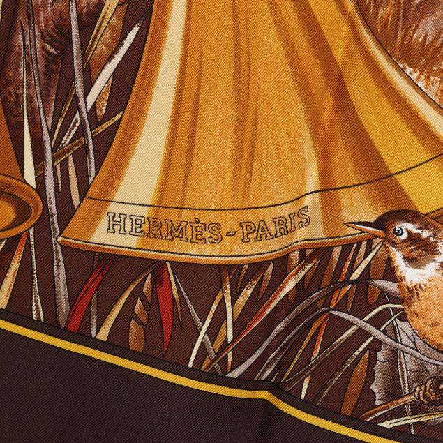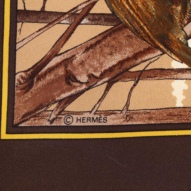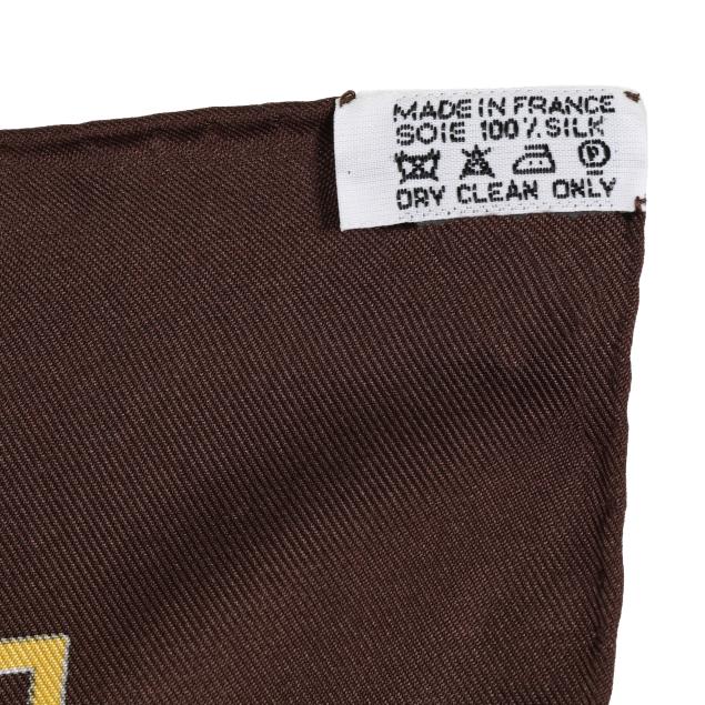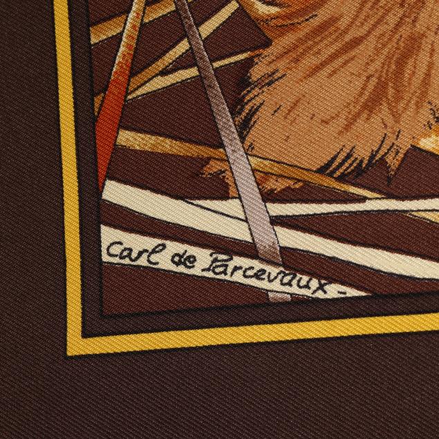 Designed by artist Carl de Parcevaux, the silk twill with rolled and hand stitched edges, with a color palette of brown, gold, and orange, and with care tag stating made in France.