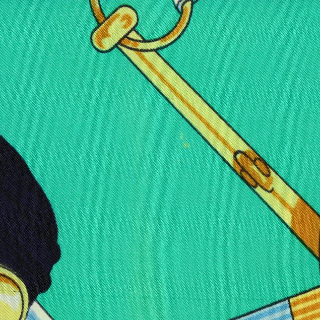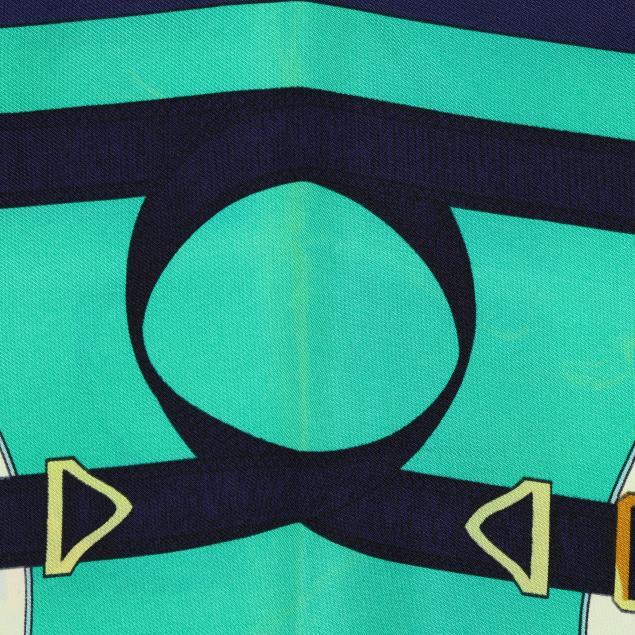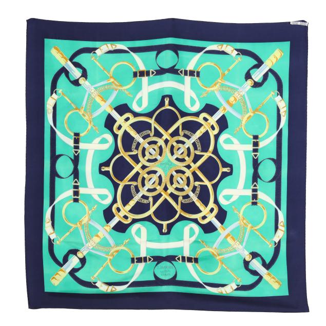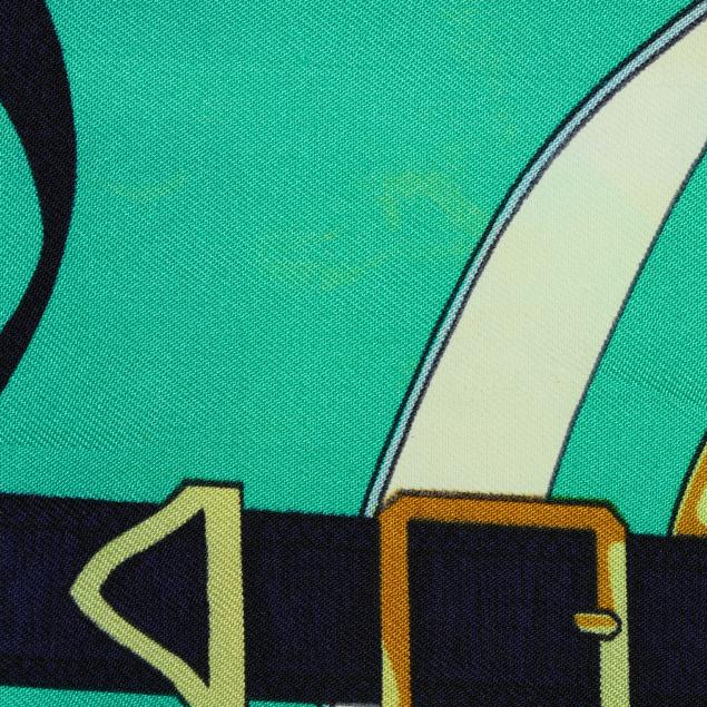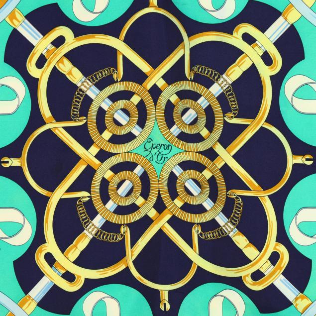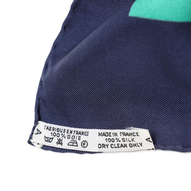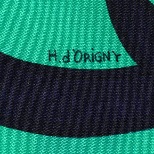 Designed by artist Henri d'Origny, the silk twill with rolled and hand stitched edges, with a color palette of blue, teal, and gold, and with care tag stating made in France.