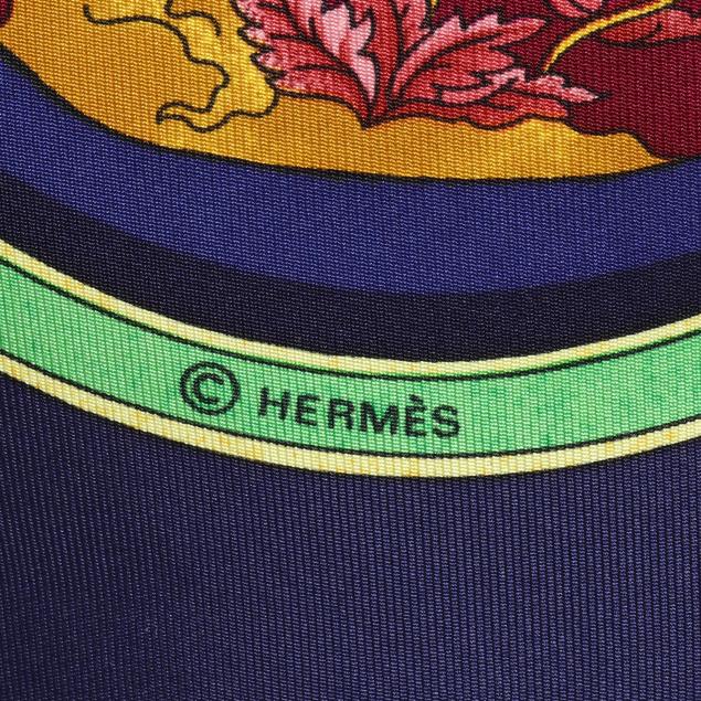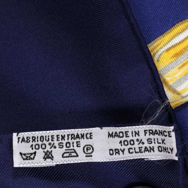 Designed by artist Catherine Baschet, the silk twill with rolled and hand stitched edges, with a color palette of blue, green, and yellow, and with care tag stating made in France.