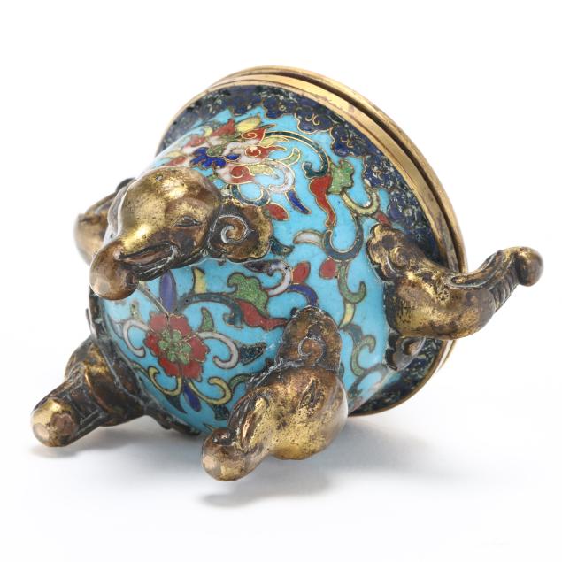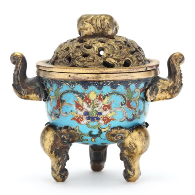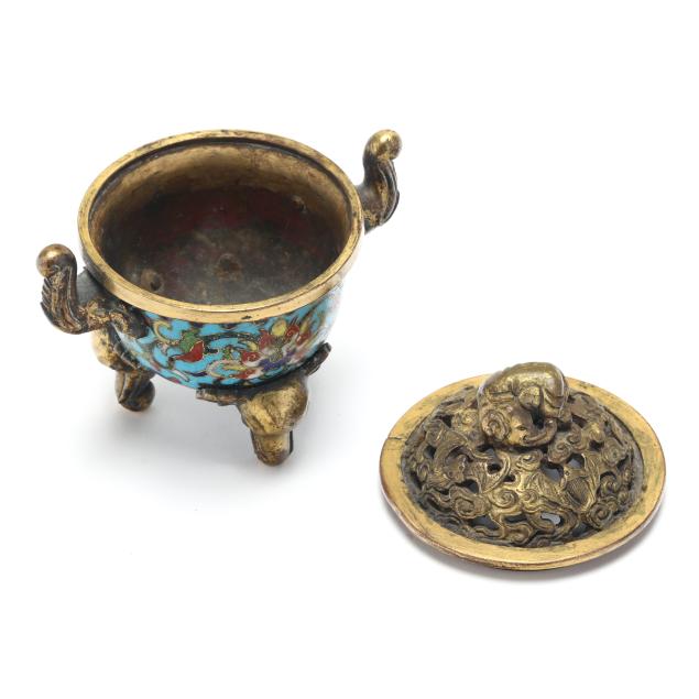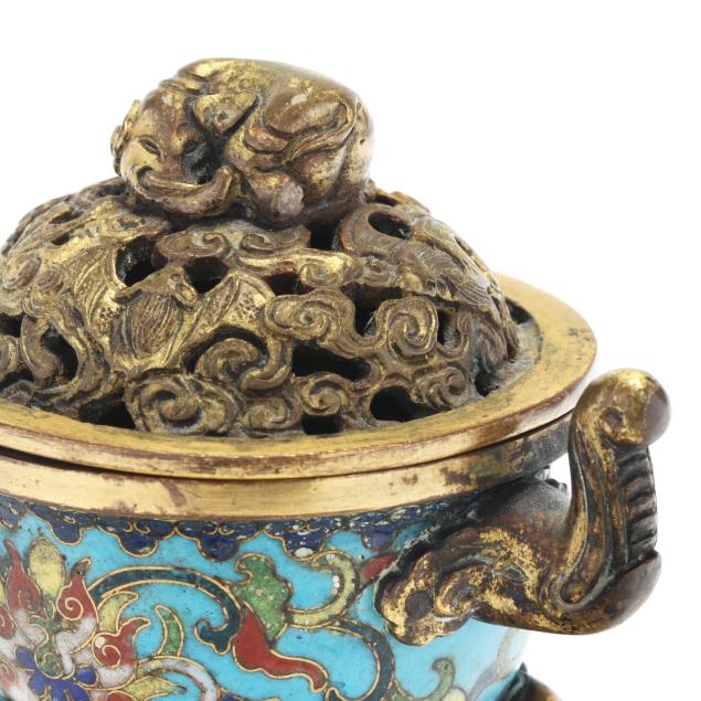 Qianlong period (1736-95), turquoise ground with lotus blossoms and scrolling tendrils in colorful enamels, a small censer with gilt bronze reticulated cover decorated with bats flying amidst swirling clouds topped with a sleeping elephant, main body with
