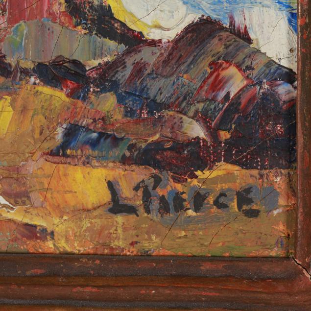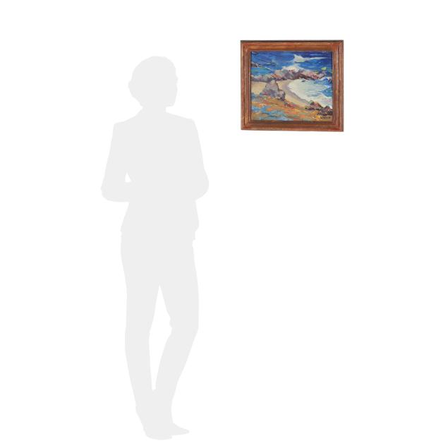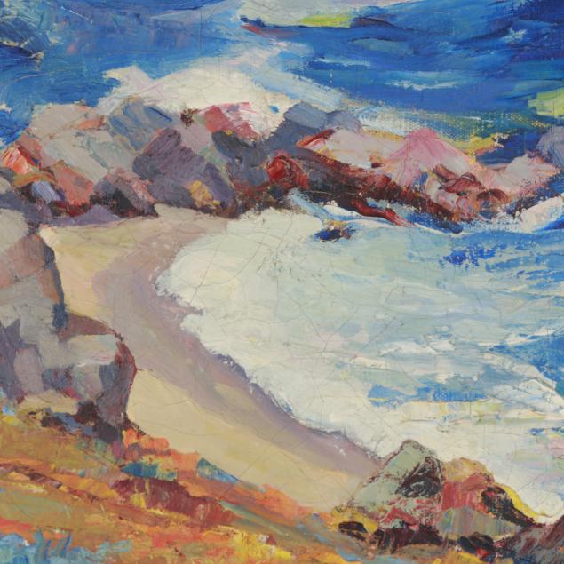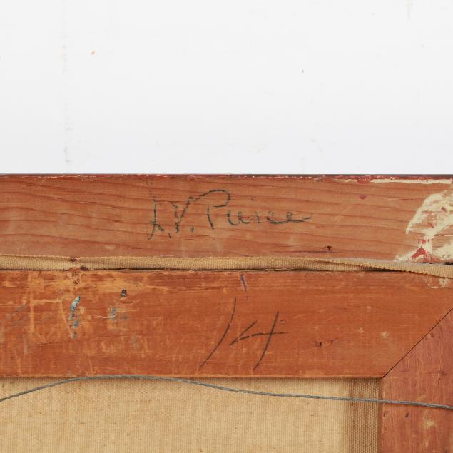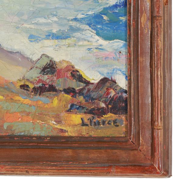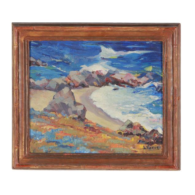 Oil on canvas, signed at lower right, inscribed "Carmel Coast $75" to top stretcher and "L.V. Pierce / Monterey" to canvas verso, presented in a period Arts and Crafts hand-carved frame.