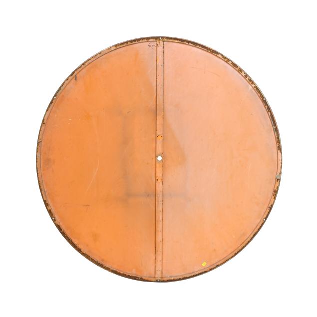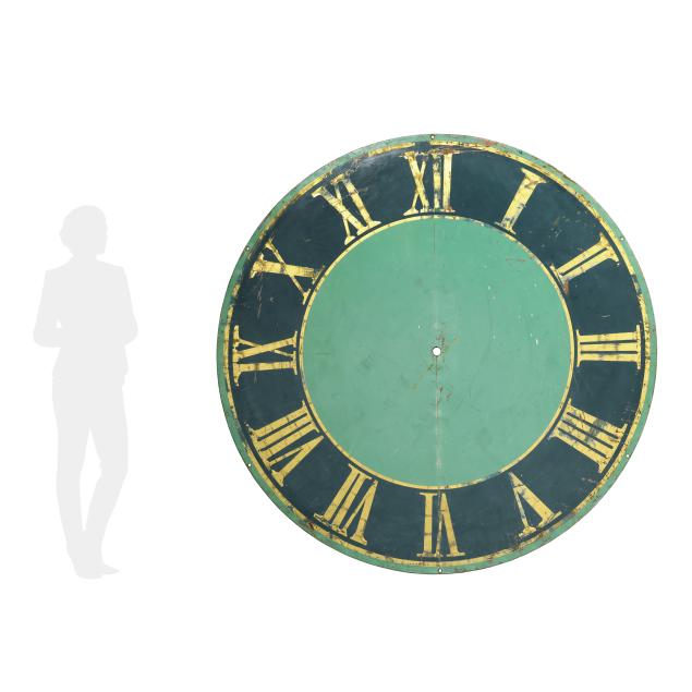 Mid-20th century, round dial face in green and gray painted copper sheeting, mounted on a steel stretcher, gilt chapter ring with stenciled Roman hour chapters, the rim pierced with six mounting eyelets, and central hands oculus, unmarked. An impressive size with nice presentation.