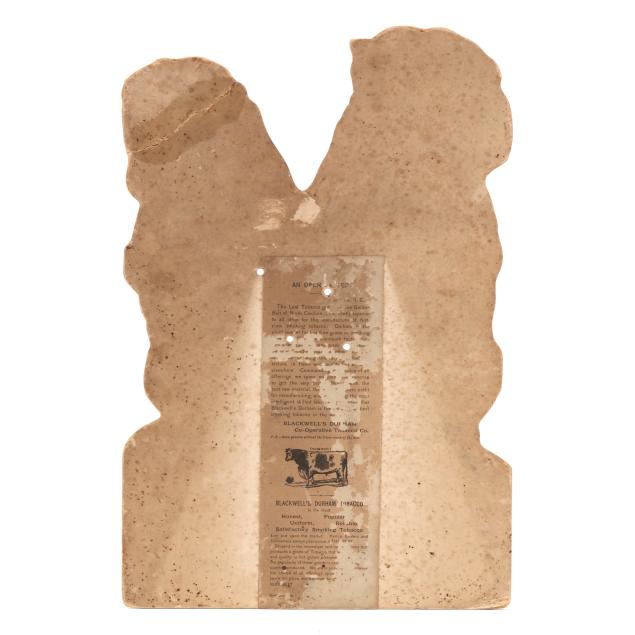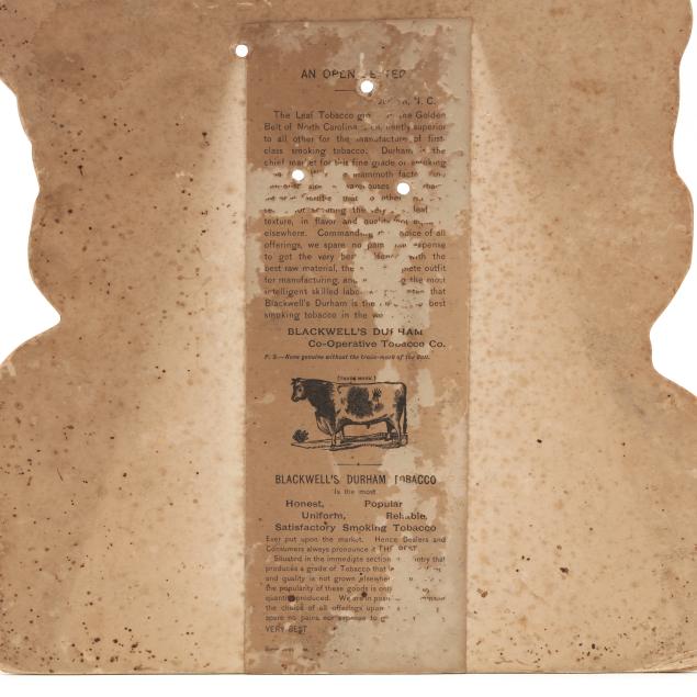 Durham, North Carolina, 1888, an advertising cutout for W.T. Blackwell & Co.'s Bull Durham Tobacco featuring two dogs with tobacco pipes atop a package of tobacco, the verso with "An Open Letter" attesting to the quality of the product.