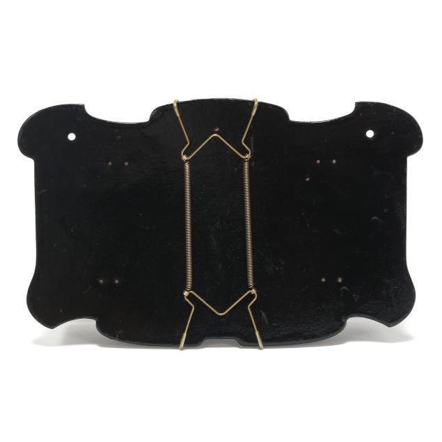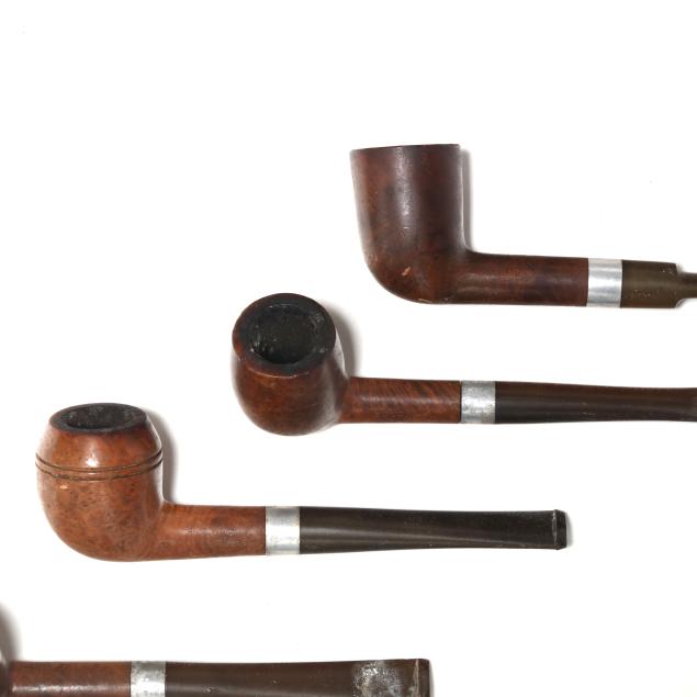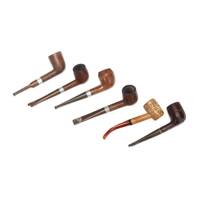 Early 20th century, rectangular form black lacquer rack with two hinged shelves decorated with gilt and handpainted scenes; this lot also includes (6) vintage tobacco pipes: (4) Trapwell briarwood pipes (Sparta, NC), a corn cob pipe, and a briarwood pipe marked "ASHELY."