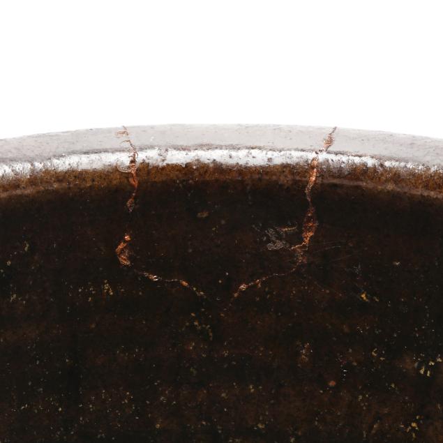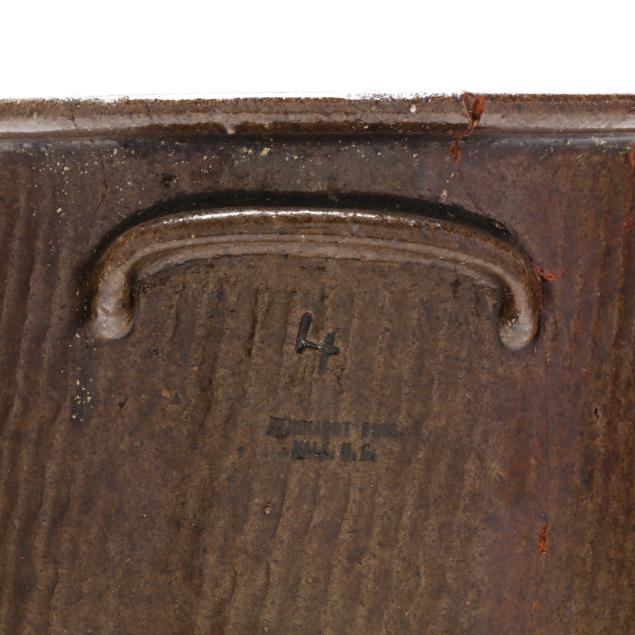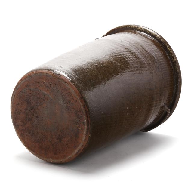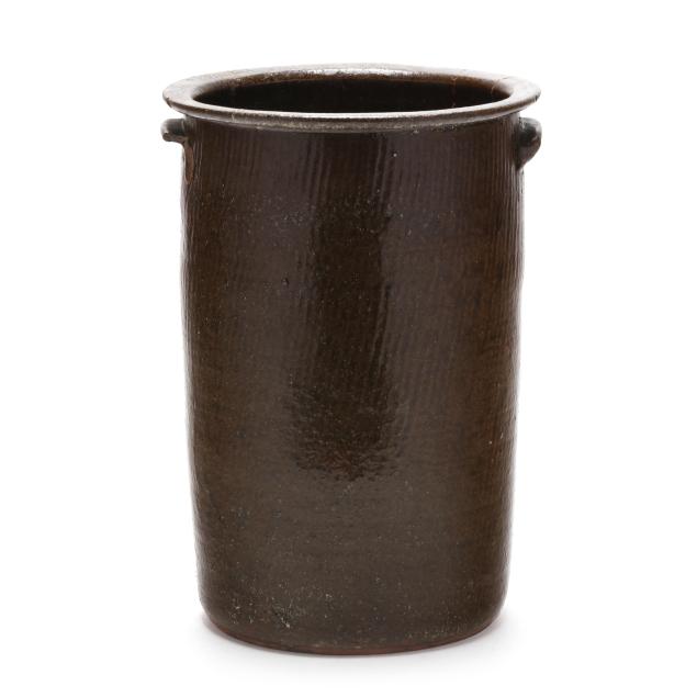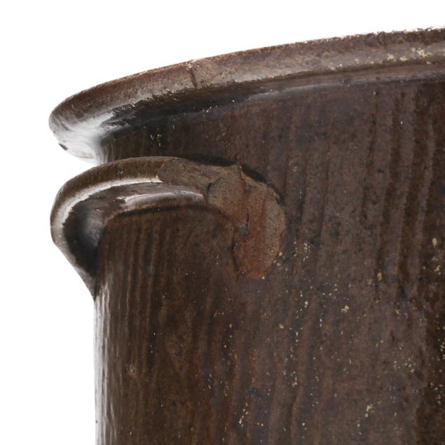 Lincoln County, circa 1930s, of tall cylindrical form with everted flat rim and applied dual lug handles, stamped "REINHARDT BROS. / VALE, N.C.," beneath an incised "4" capacity mark, featuring a dark alkaline glaze over a wavy textured surface.