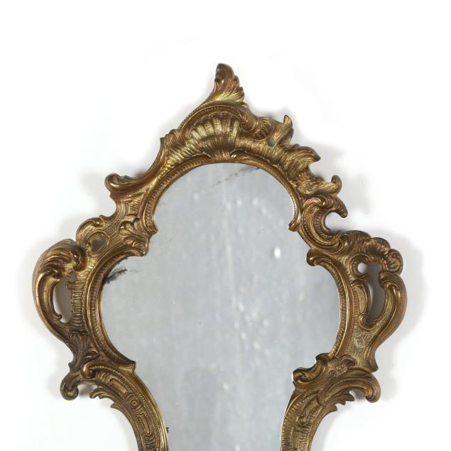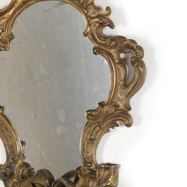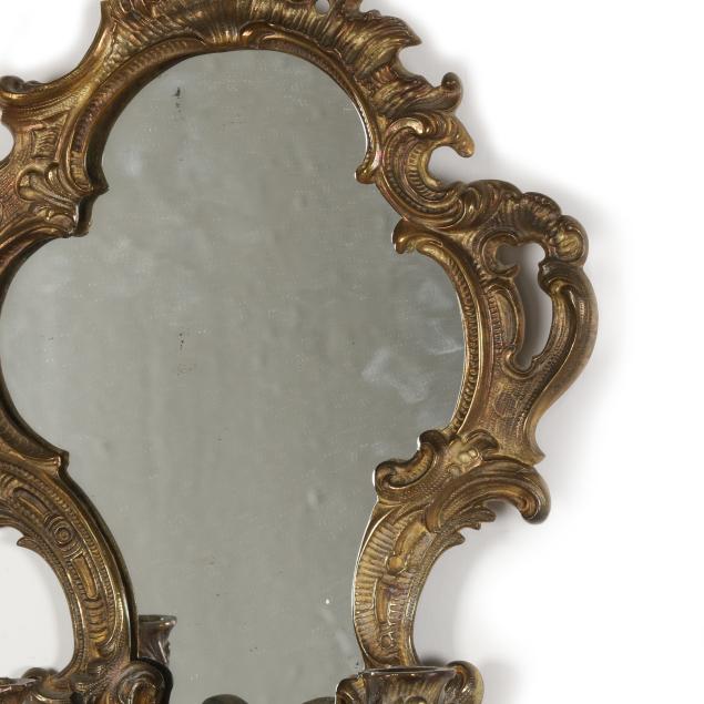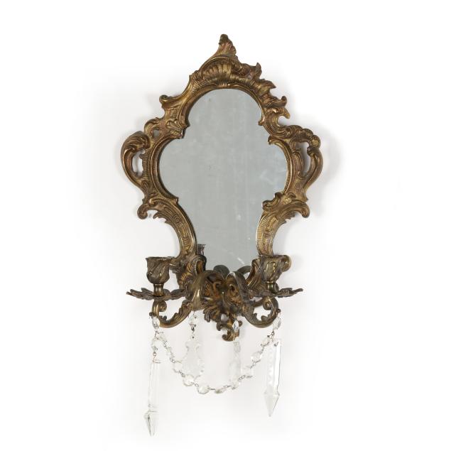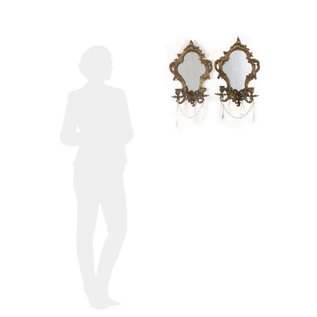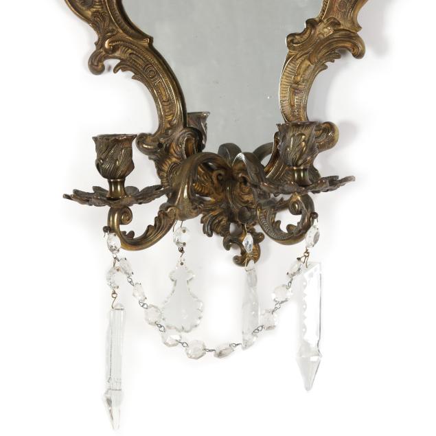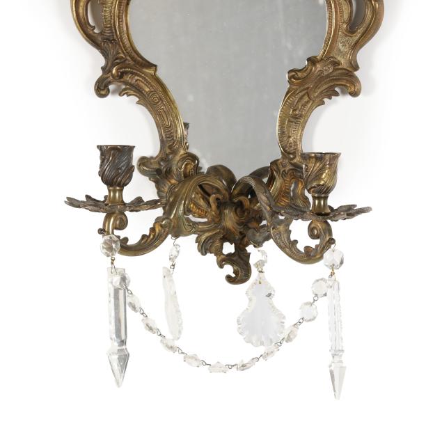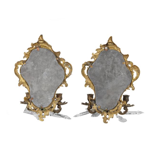 France, mid-19th century, of lobed form with scrolling foliate motifs, each with two candle stems with spreading leaf form bobeches and draping crystal drops, one mirror marked "DEPOSE" to verso, both frames marked "FRANCAIS" to verso.