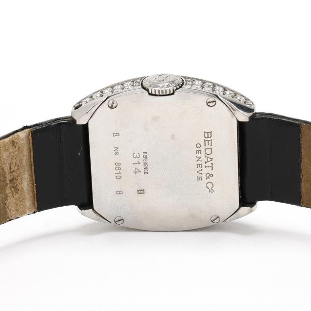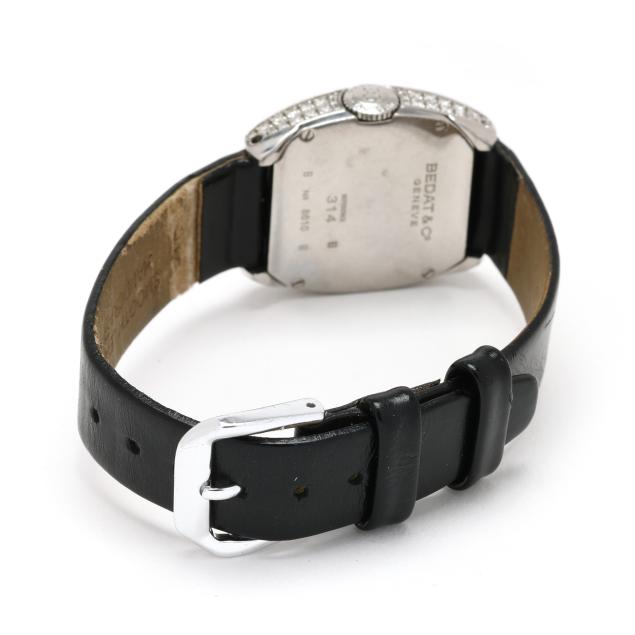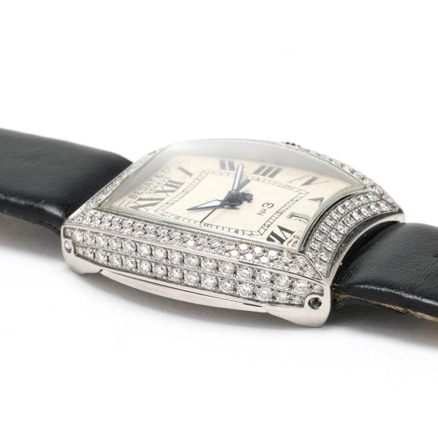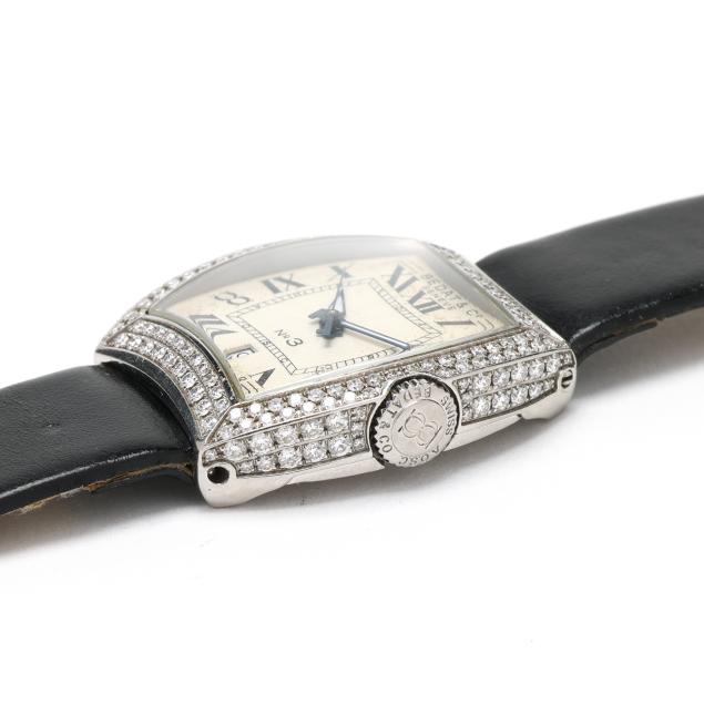 Automatic, ETA 2000-1, reference number 314, serial number 8610, the tonneau stainless steel case set throughout with full cut round diamonds weighing approximately 2.2 total carats (H-I color, VS1-VS2 clarity), the signed cream guilloché dial with black Roman numeral hour markers, blued steel dagger hands, and date window at 6:00 hour, the black leather strap signed deBeer, completed with a silver-tone buckle, the caseback signed and numbered.