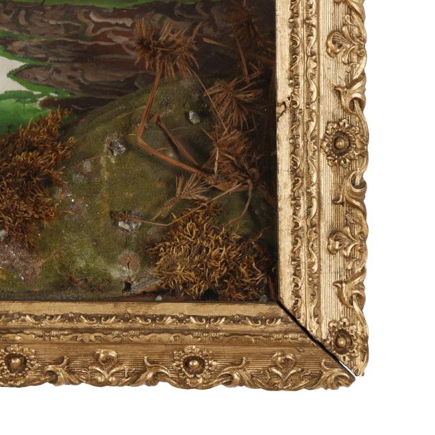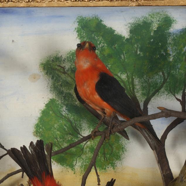 Late 19th to early 20th century with later enhancements, (4) taxidermy birds including a hummingbird, a yellow warbler, and (2) Brazilian tanagers set within staged setting of branches, dried flora, and faux rockwork, with a newer painted landscape to back panel, all set within a giltwood frame and paper wrapped shadow box, unsigned.