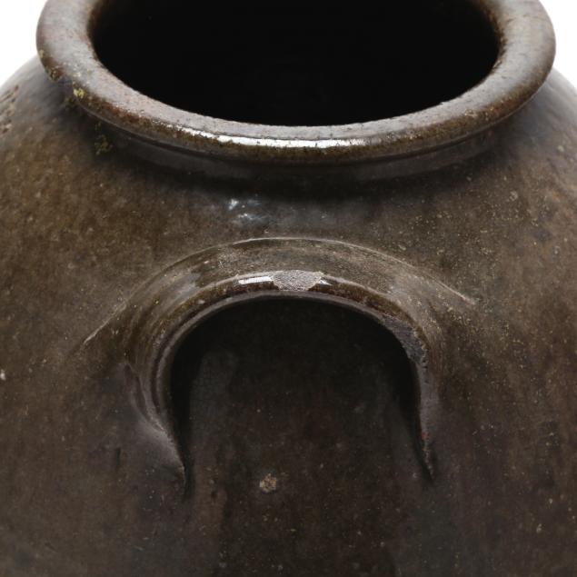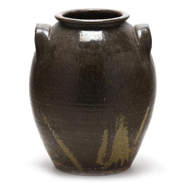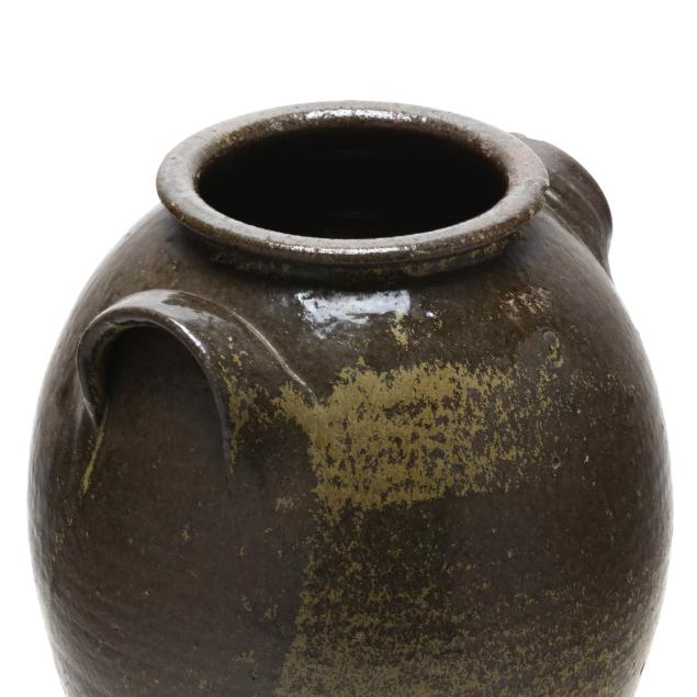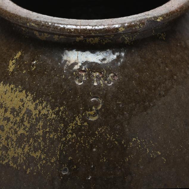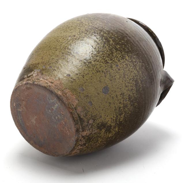 Alkaline glazed stoneware, ovoid form with applied ear handles and flat rim, warm olive alkaline glaze with golden areas of rutile, maker's stamp at shoulder "JFS" above the "3" capacity mark.