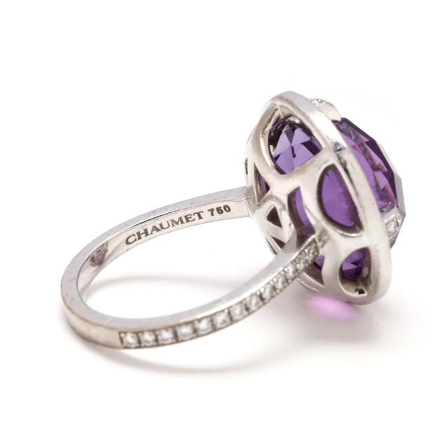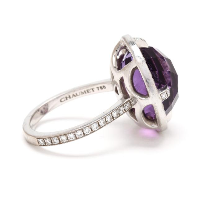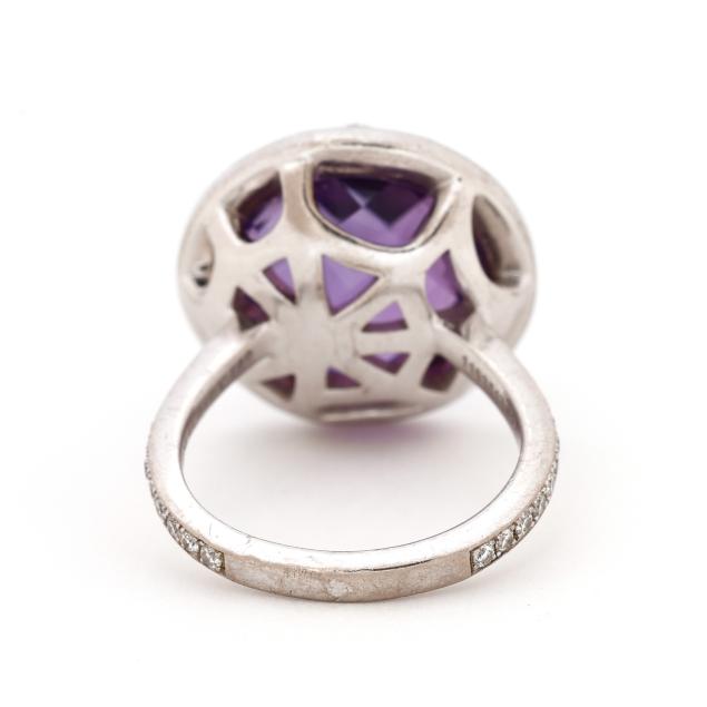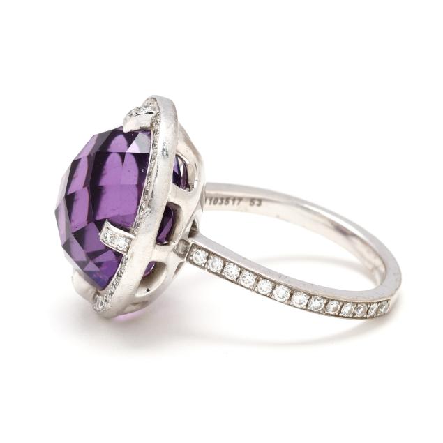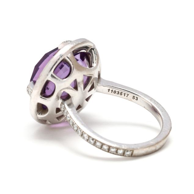 Attrape-moi...si tu m'aimes collection, centered on a round checkerboard cut amethyst (14.5mm) the halo, prongs, and shoulders set with full cut round diamonds weighing approximately .60 total carat (F-G color, VS1-VS2 clarity), numbered 1103517 5, signed, and stamped 750 and with partial French hallmark.