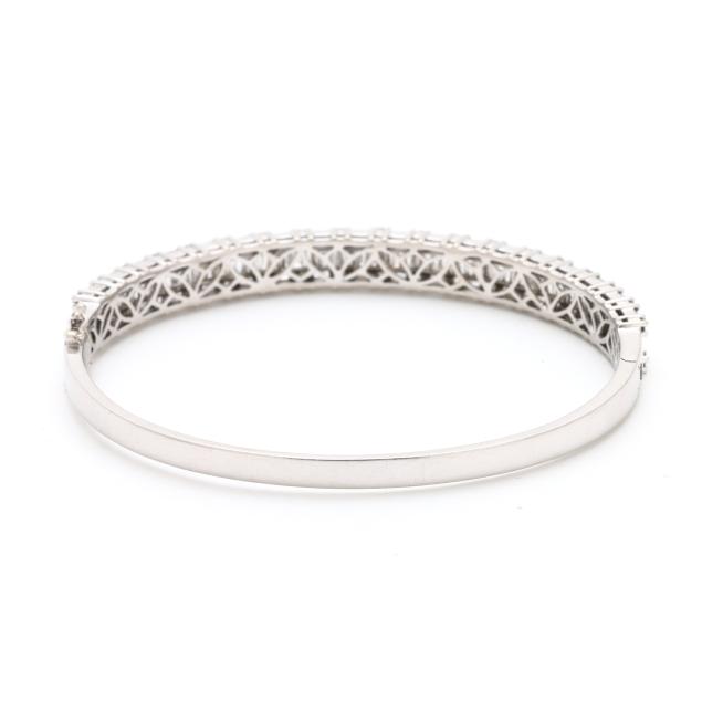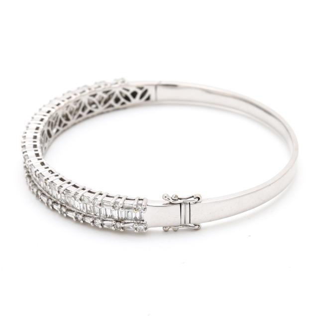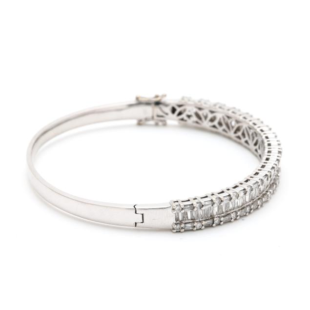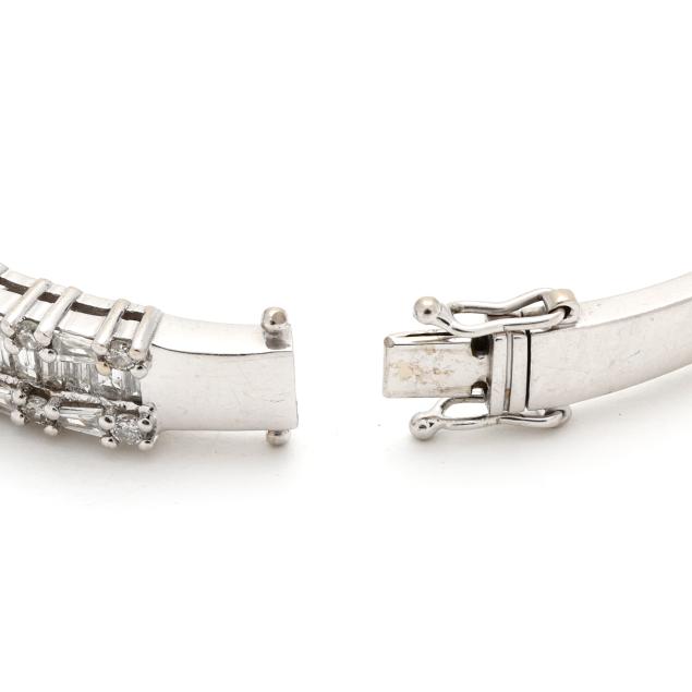 The hinged bangle bracelet channel set with tapered baguette cut diamonds, and set to the edges with tapered baguette cut and full cut round diamonds, completed with an integrated box clasp and two figure eight safeties, stamped 585. The total diamond weight is approximately 5.50 total carats (G-H color, SI1-SI2 clarity).