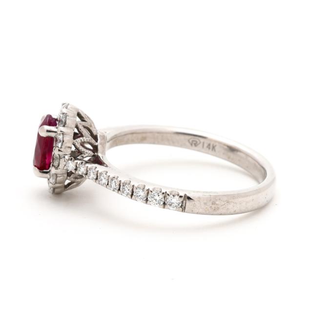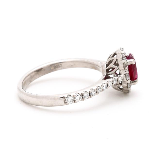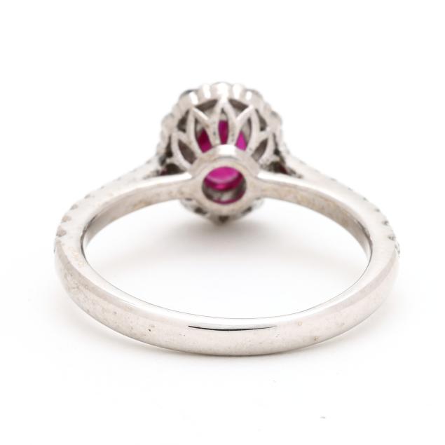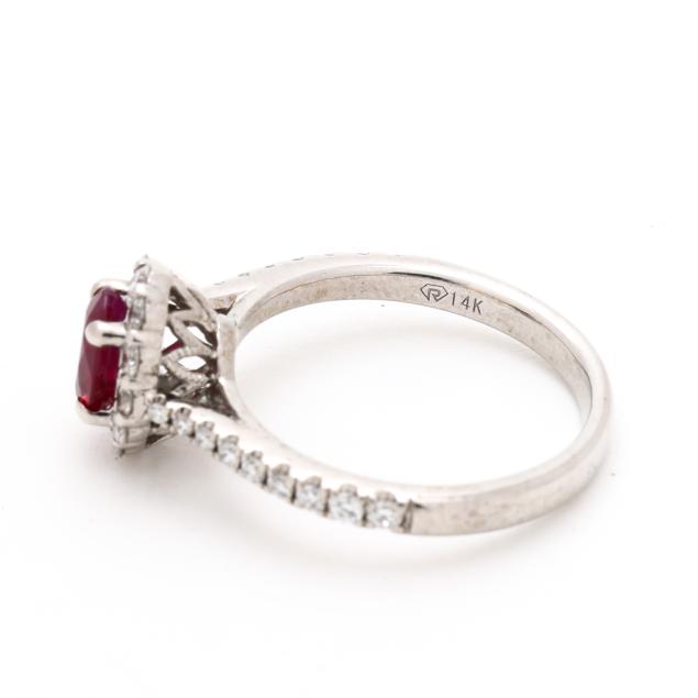 Centered on an oval cut ruby (7.0 x 4.9 x 2.9mm) weighing approximately .65 carat, set to the halo and the shoulders with full cut round diamonds weighing .52 total carat (G-H color, SI2-I1 clarity), stamped 14K / D052 and with a maker's mark.