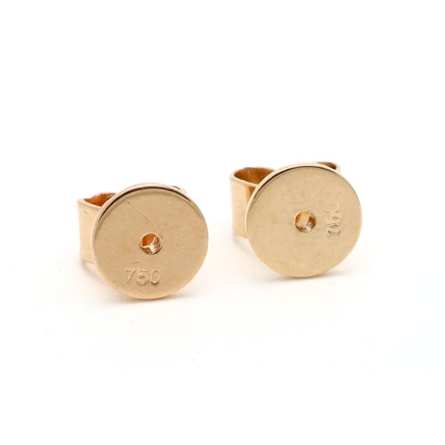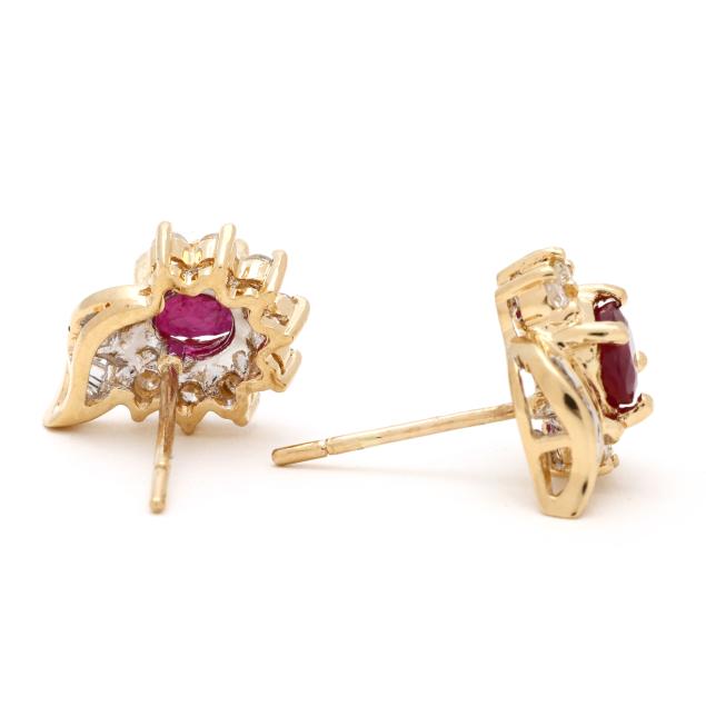 Centered on an oval cut ruby (6.1 x 4.1 x 2.9mm; 6.1 x 4.2 x 3.2mm) weighing approximately 1.00 total carat, within a surround of full cut round and baguette cut diamonds weighing approximately .50 total carat (H-I color, SI1-I1 clarity), completed with posts and friction backs, testing 18KT, backs stamped 750.