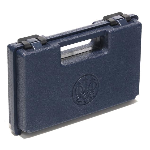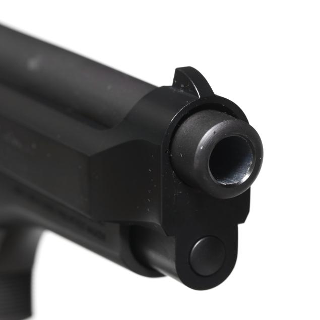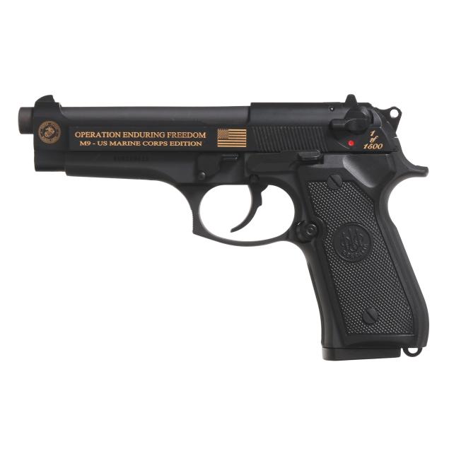 Serial number BER289622 present along left side of frame, insignia of United States Marine Corps present in gold colored stencil along left side of frame at muzzle, text of OPERATION ENDURING FREEDOM M9 - US MARINE CORPS EDITION present in gold colored stencil along left side of slide adjacent to gold colored American flag, stencil text of 1 OF 1500 present at left rear of slide in gold colored stencil, ambidextrous manual thumb safety with decocker, blue plastic factory box.