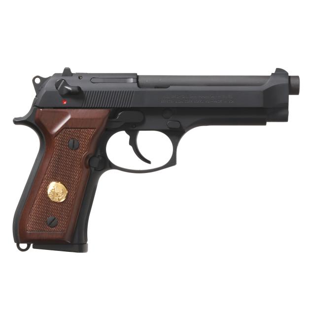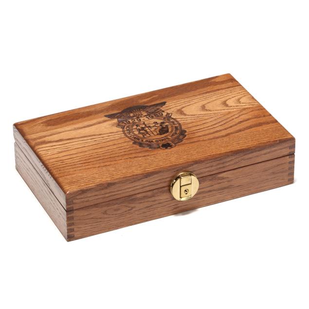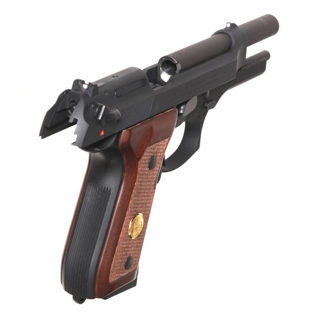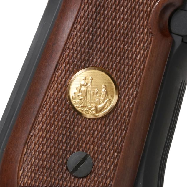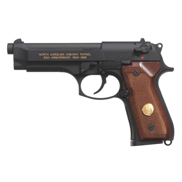 Serial number NCHPC0953 present along left side of frame, text of NORTH CAROLINA STATE HIGHWAY PATROL 60TH ANNIVERSARY 1939-1999 present along left side of slide in gold color stencil, ambidextrous manual thumb safety with decocker, one magazine, checkered walnut grip scales with NCSHP badge inlaid as gold color medallion, oak display case with manual and key.