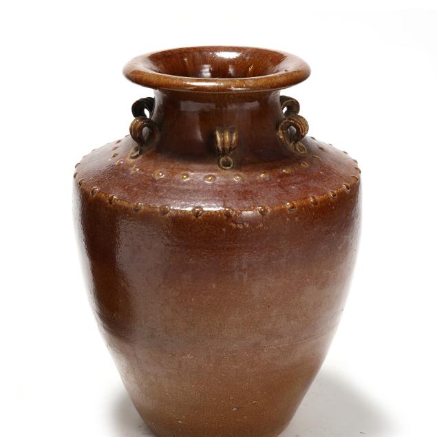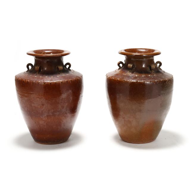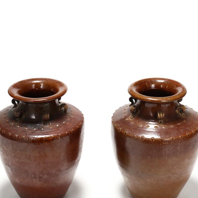 20th century, turned earthenware with brown glaze, each of stately tapering form, with six applied loop handles surrounded by concentric round boss relief decoration to the shoulder, unmarked.