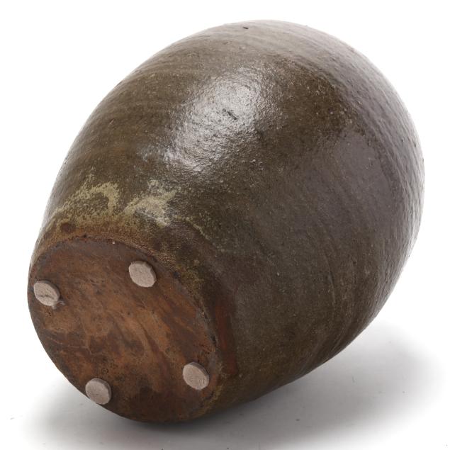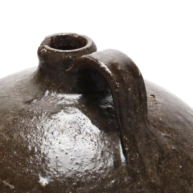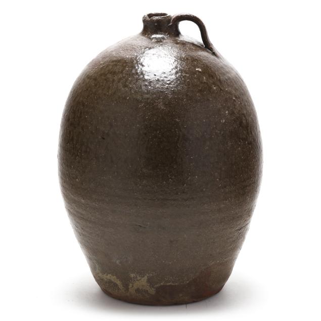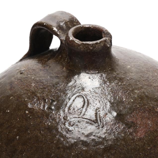 Circa late 19th century, impressed "M L" to the shoulder beside an incised "2" capacity mark, highly-ovoid jug with small semi-rounded spout and handle, dark olive alkaline glaze surface.